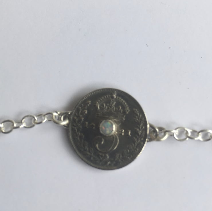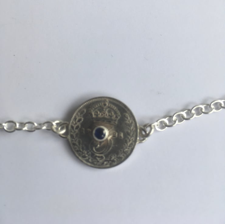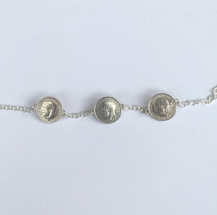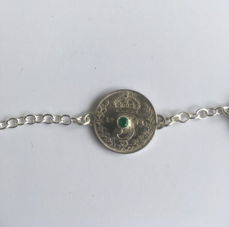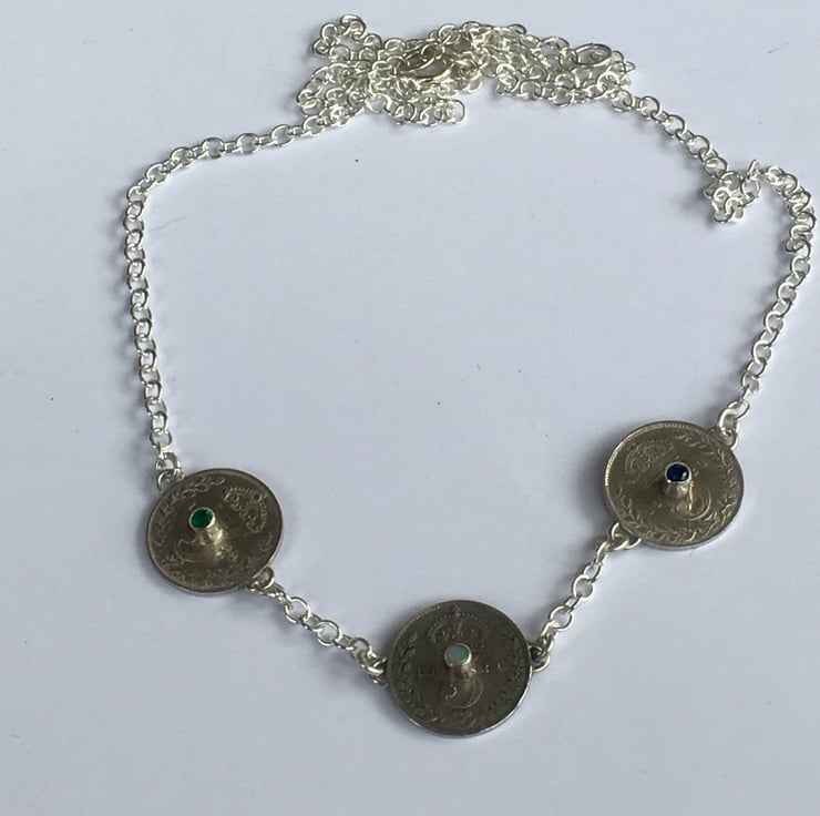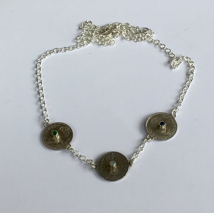 This stunning necklace has three Threepence coins each dated 1921, they have been hand set with a beautiful deep sapphire, emerald and a pretty opal. The substantial Sterling silver chain is a 3mm trace chain and has connections at approx 43 and 54 cm which makes it wearable with any neckline.