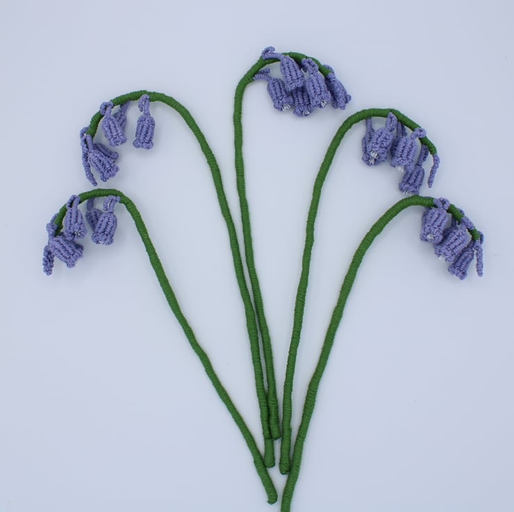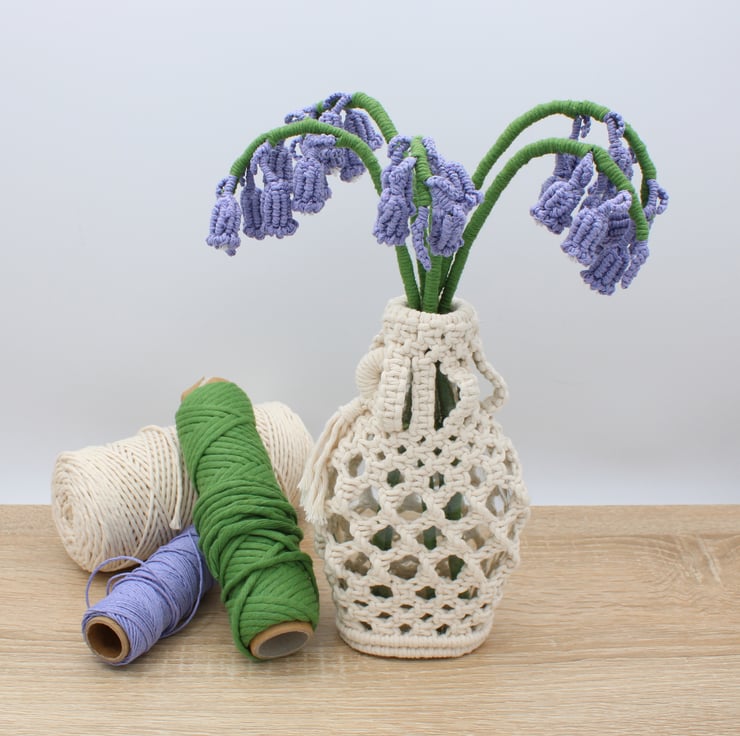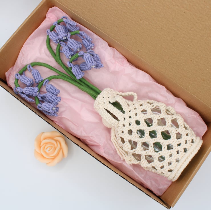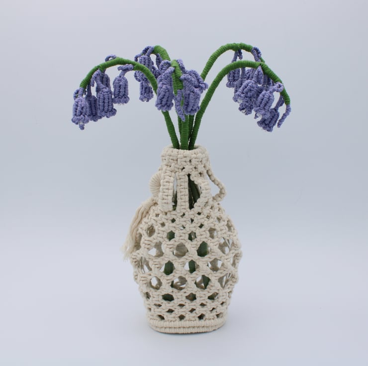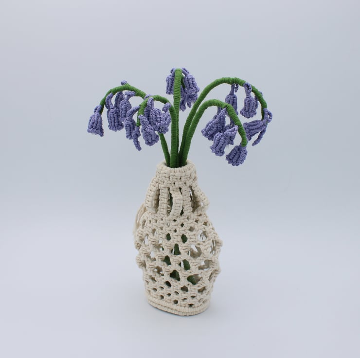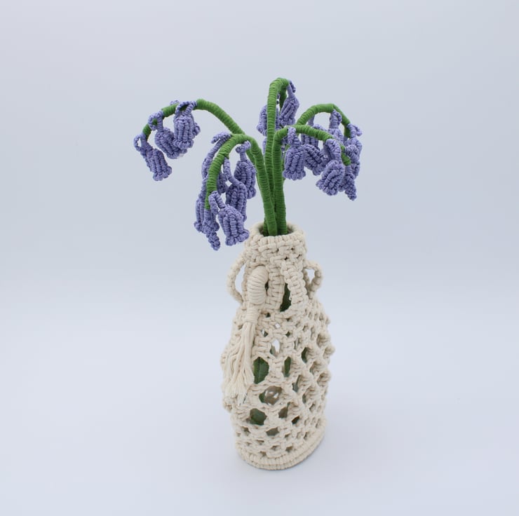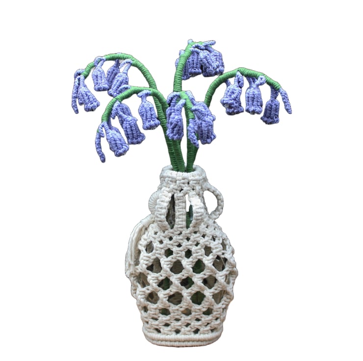Now you can have bluebells all year round with this everlasting display of 5 stems arranged in a decorative vase. Every macrame bell has been crafted by hand to create these wonderful flowers. You will notice that the bells all hang on one side of the stem. This is because they are modelled after the native English Bluebells.