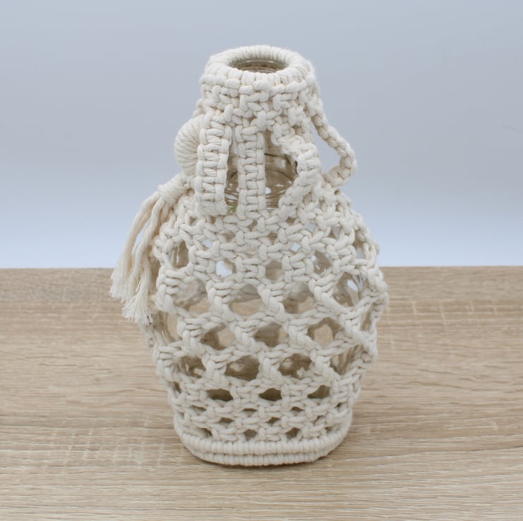 I am a great believer in recycling and upcycling where possible and have created the vase using a maple syrup bottle which I think has such an interesting shape. I have given the bottle a makeover by overlaying it with an intricate macrame design using raw recycled cotton.