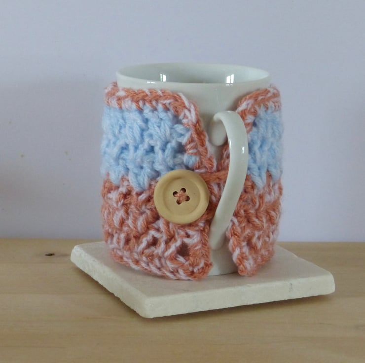 A crocheted Mug Cosy using two strands of yarn. The bottom half of the cosy and border are in Vintage Peach and White and the top half is Baby Blue and White. It measures approximately 24cm long by 8.5cm wide so should fit most standard mugs. Just wrap it around and fasten with the crocheted loop and natural wood button. An ideal gift for a Tea or Coffee lover.