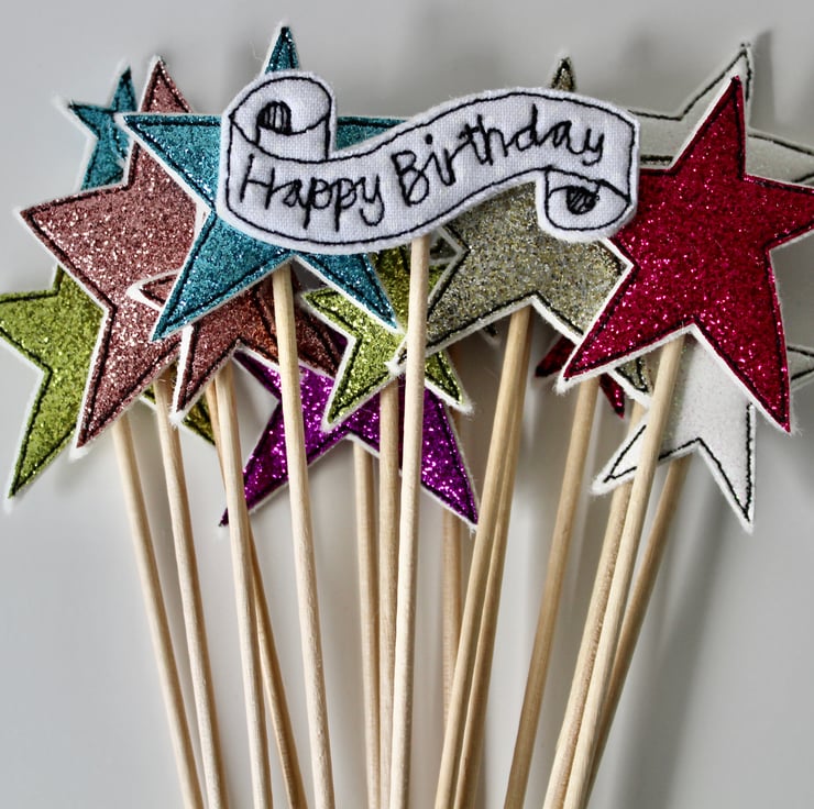 The set includes fifteen toppers; fourteen various sizes of glittery star and one 'Happy Birthday' banner.