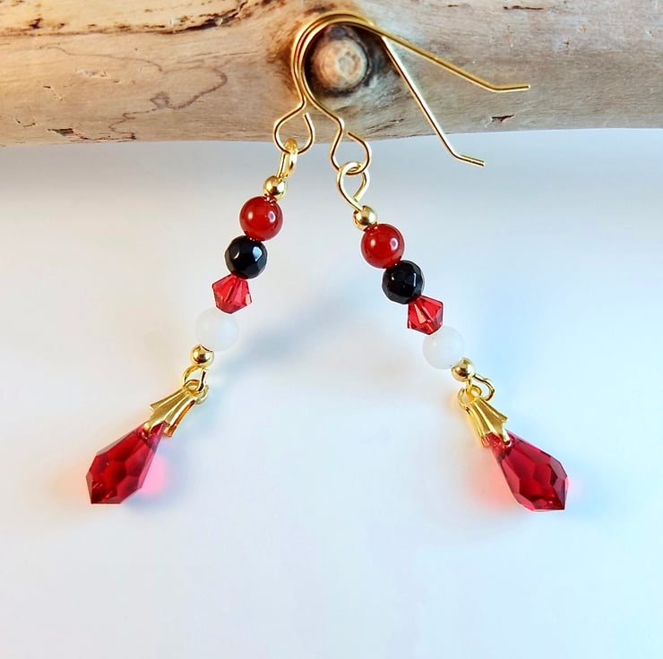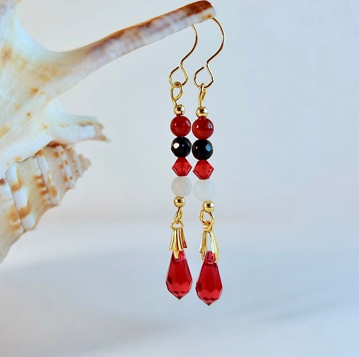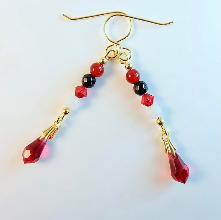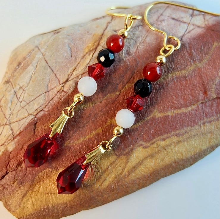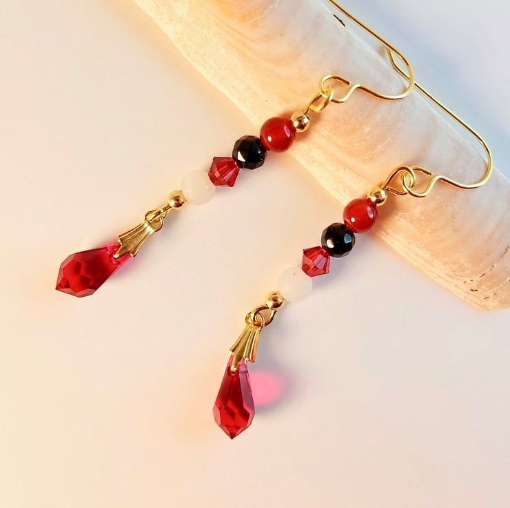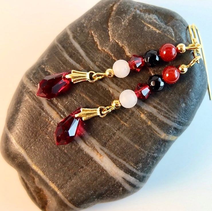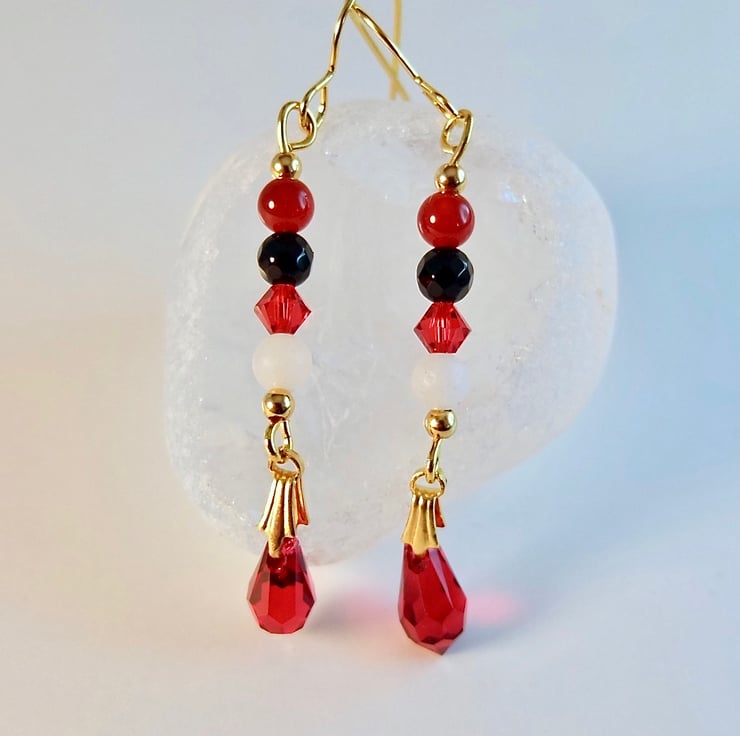 A Faceted Swarovski 'ruby' red crystal teardrop, measuring 10x6mm, hangs below 4mm beads of frosted white Jade, Swarovski 'ruby' crystal, faceted black Onyx and red Carnelian.