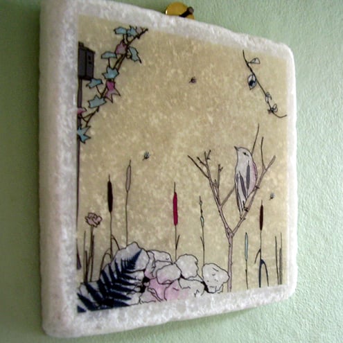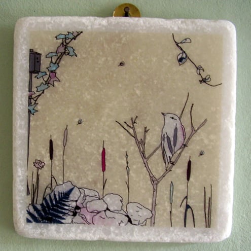 white marble tile featuring an original 'littlebirdy' design to hang on your wall!