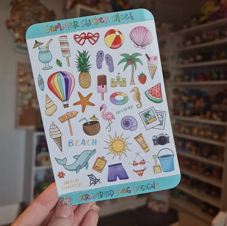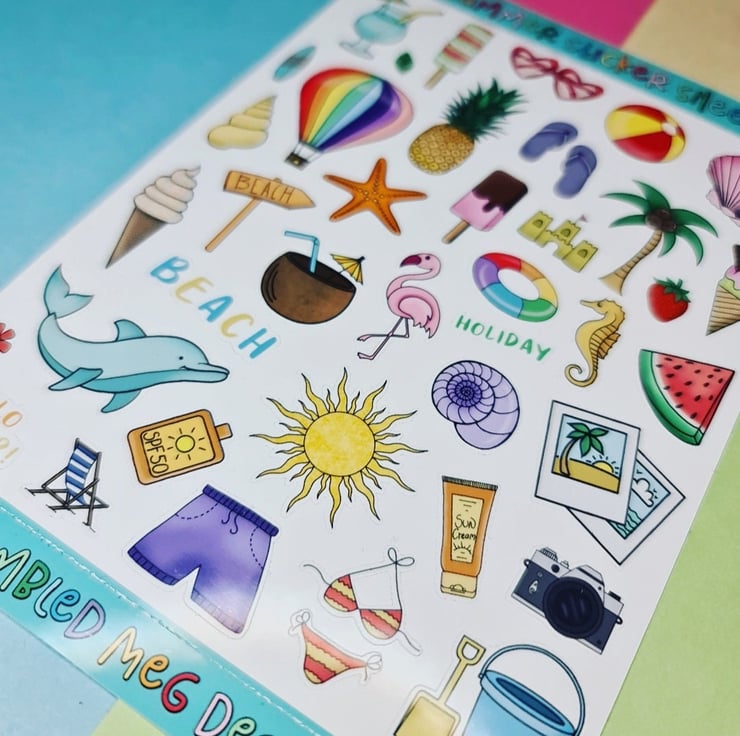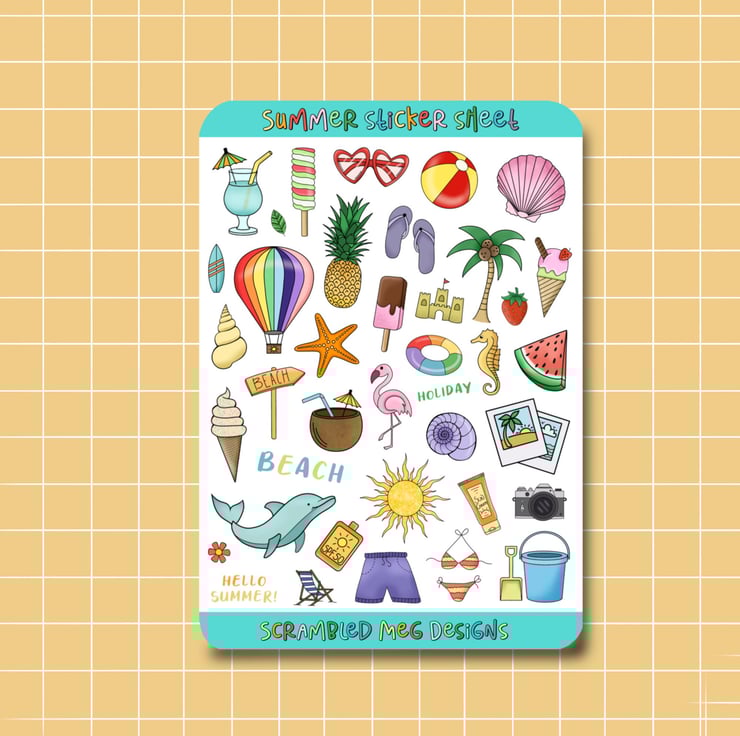 Summer sticker sheet with 39 individual glossy vinyl stickers! A6 sheet size so perfect stickers for summer holiday planners, journals and diaries!