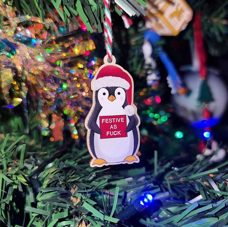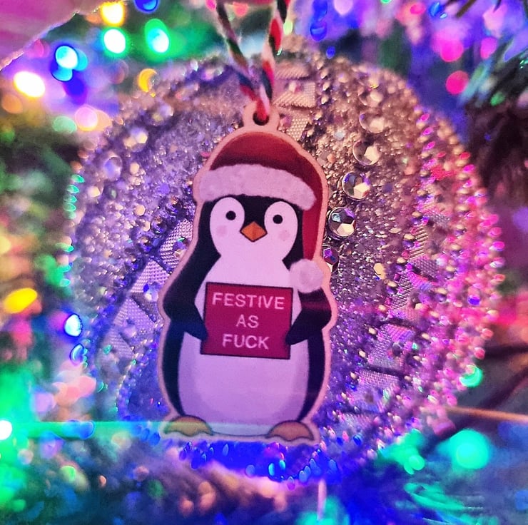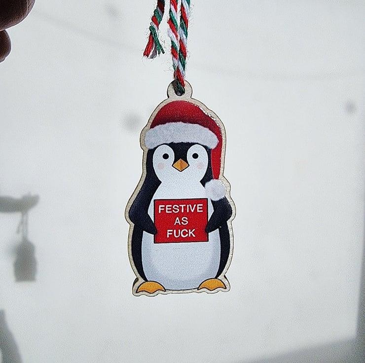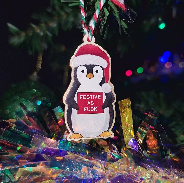 This cheeky penguin is the perfect edition to your Christmas tree! Featuring my own cute penguin illustration holding a sign that reads 'FESTIVE AS FUCK'.