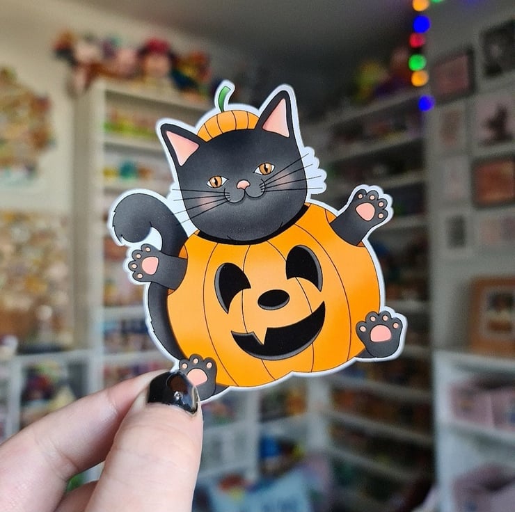 Cute black cat in a pumpkin illustrated sticker! Perfect for all Halloween, fall and spooky cat lovers!