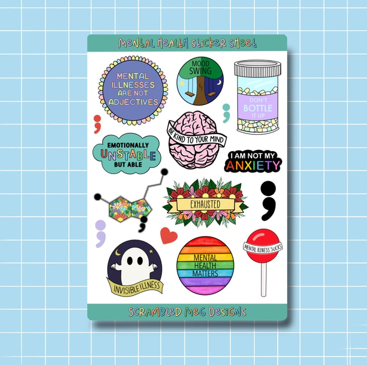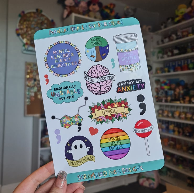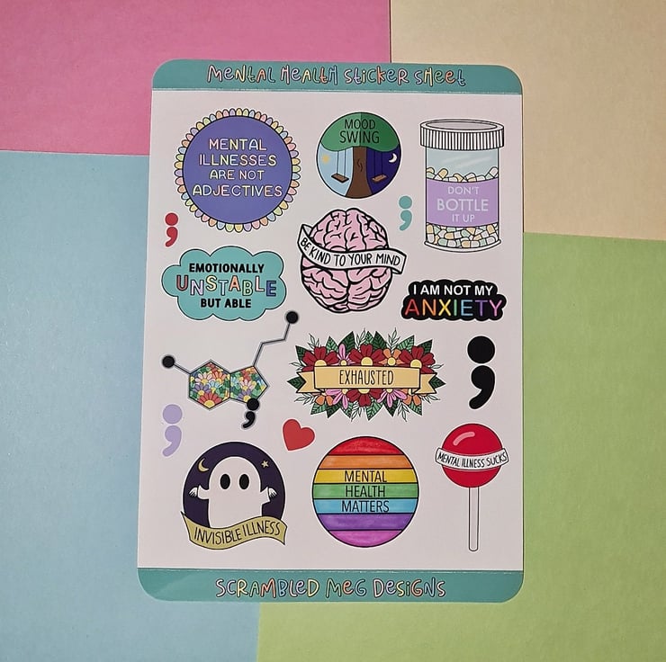 A5 Mental health themed sticker sheet with 16 glossy vinyl, water-resistant stickers.