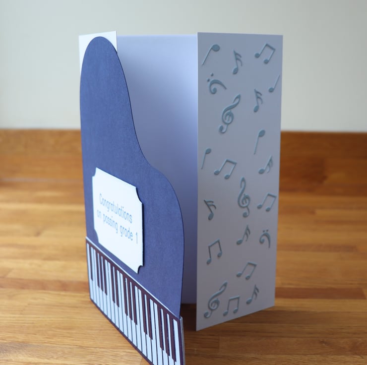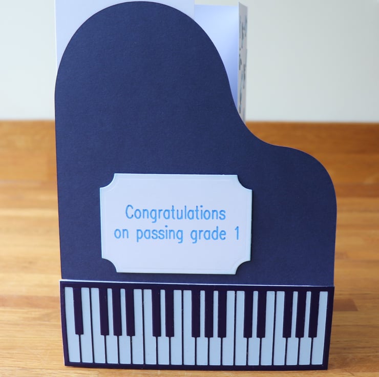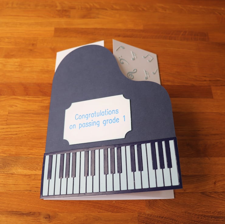 The front of the card is a grand piano keyboard with lid in dark and pastel blue, and on the other side are music notes, the sentiment is Congratulations on passing Grade 1.
