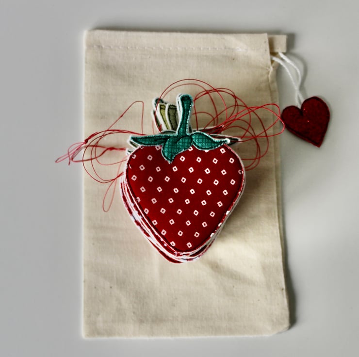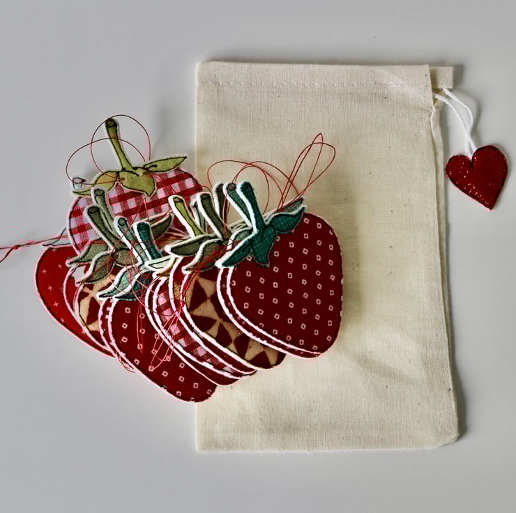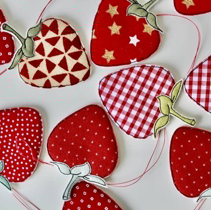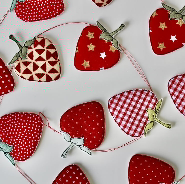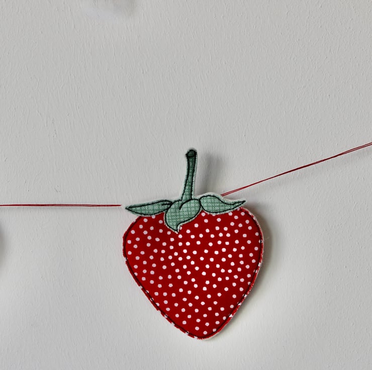 Each of the twelve strawberries suspended along this garland, is sewn using a combination of 100% wool felt, cotton cloth and free hand machine embroidery; multiple layers of cloth are sewn together and cut out by hand using very sharp scissors.