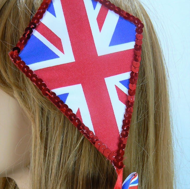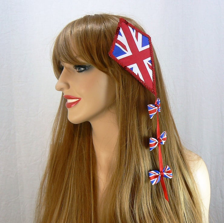 This union jack kite hair accessory has three union jack bows on the kite ribbon tail which dangles and creates movement as you move.