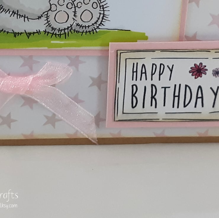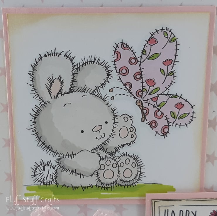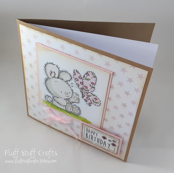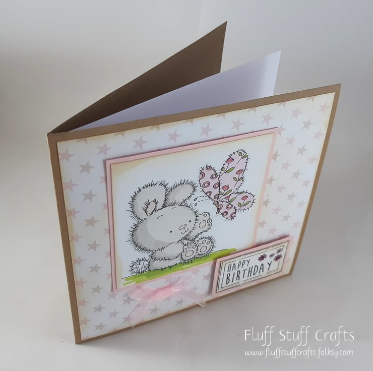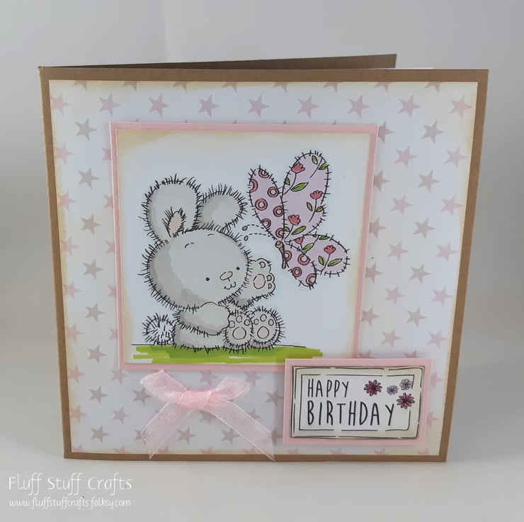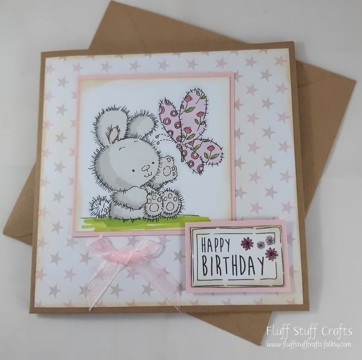 Square kraft birthday card featuring a hand coloured image of a rabbit and a butterfly with patterned wings. The image and sentiment 'Happy Birthday have been mounted onto pale pink card and overlaid onto a background of pale pink and pale brown stars.The card is finished with a pale pink organza ribbon bow.