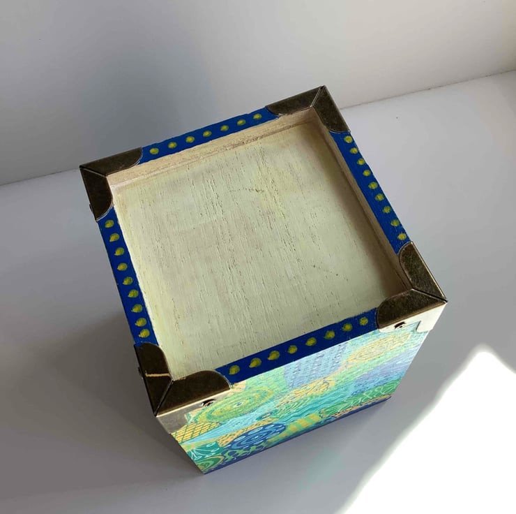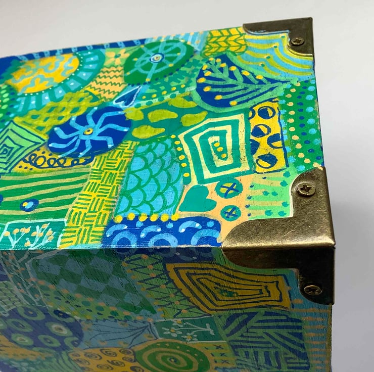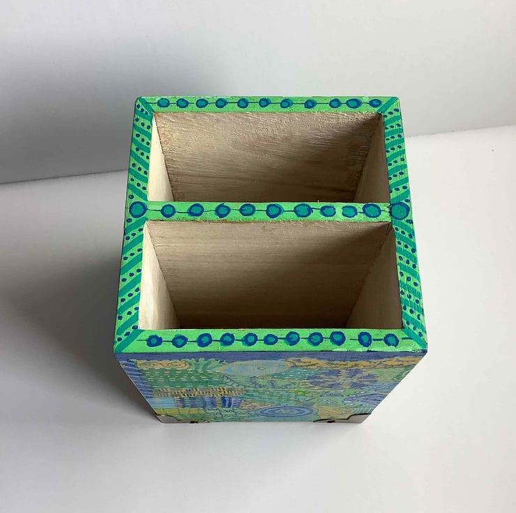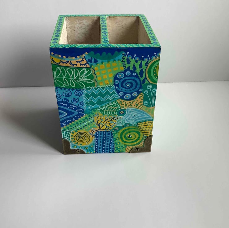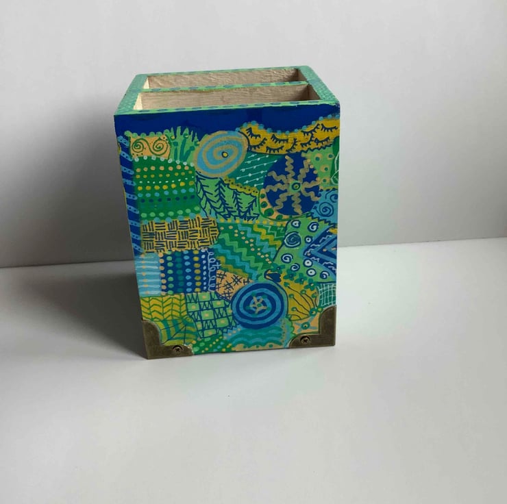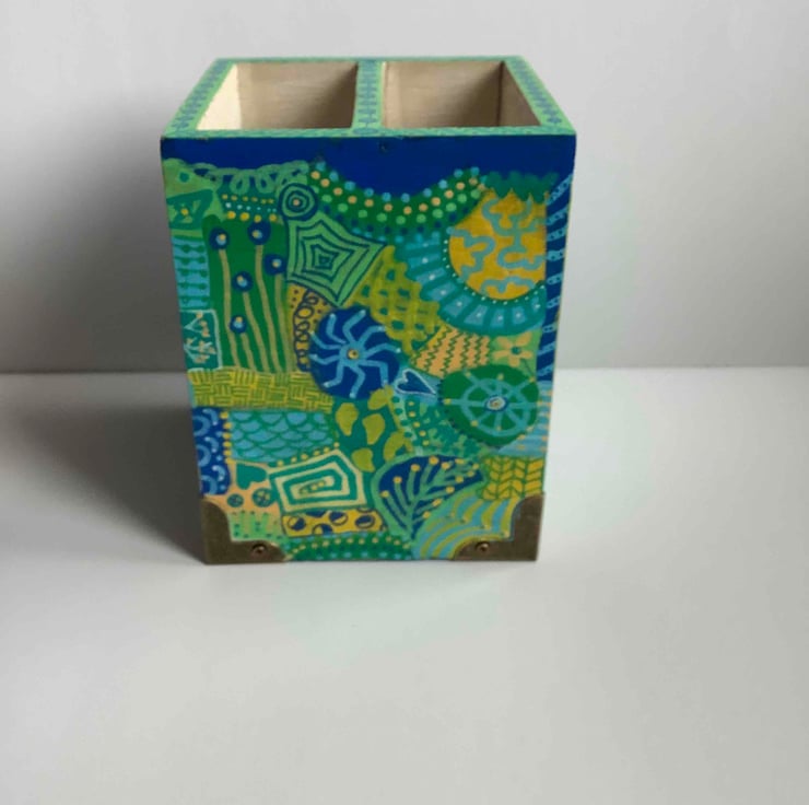 This wooden holder is colourfully hand painted in vibrant, abstract and colourful designs,