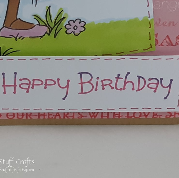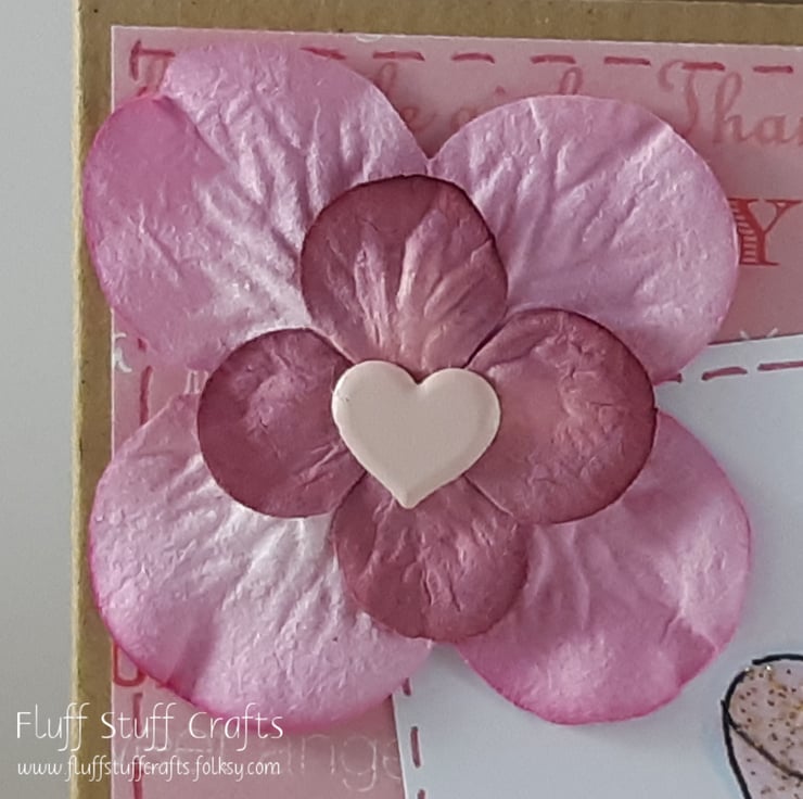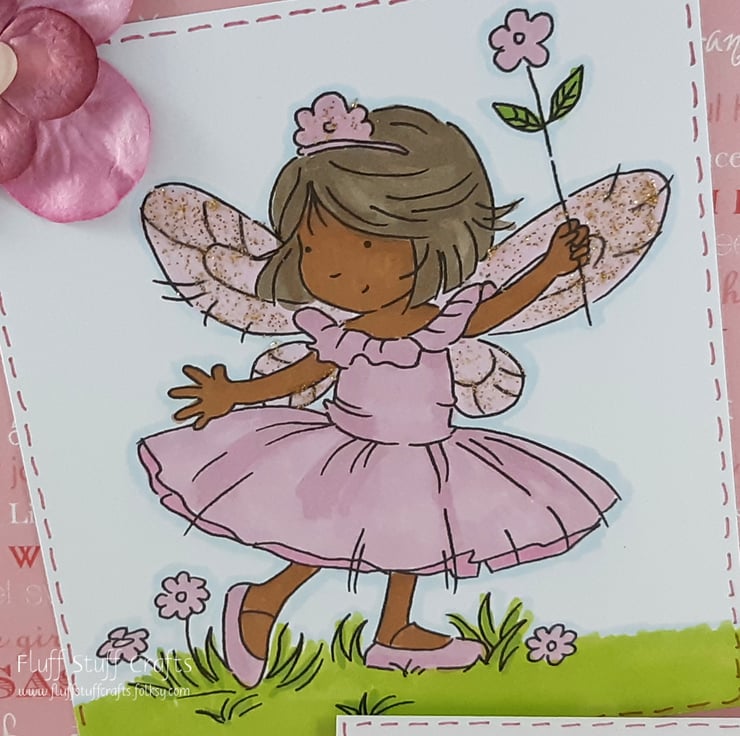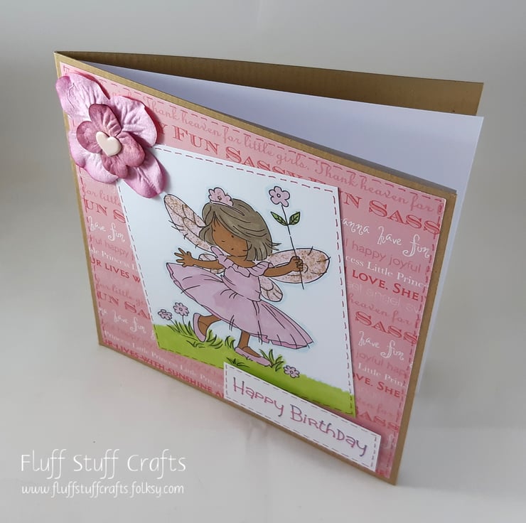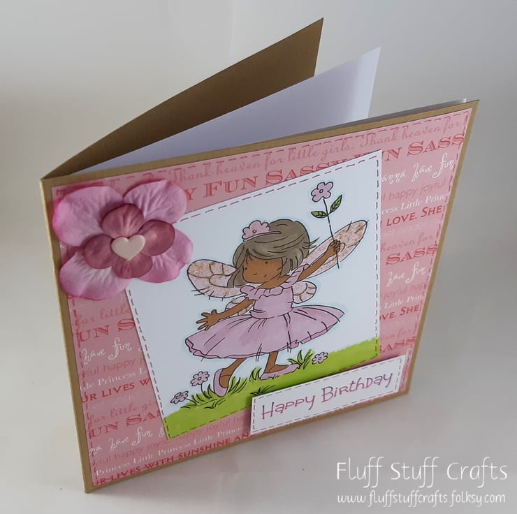 Square kraft card for a child's birthday. The card features a hand coloured girl in a pink dress with glittered fairy wings and tiara and a pink flower in hand. Both the image and the sentiment 'Happy Birthday' have been edged with pink dotted lines and overlaid onto a background of phrases related to little girls. The card is embellished with pink paper flowers with a heart shaped brad at the centre.
