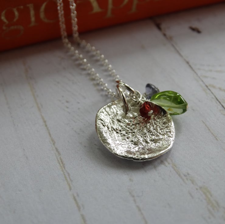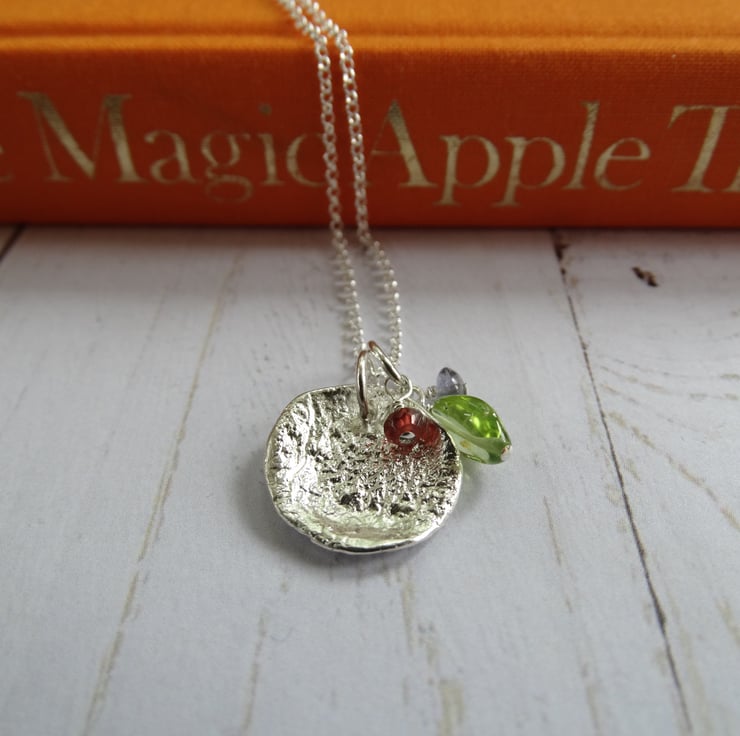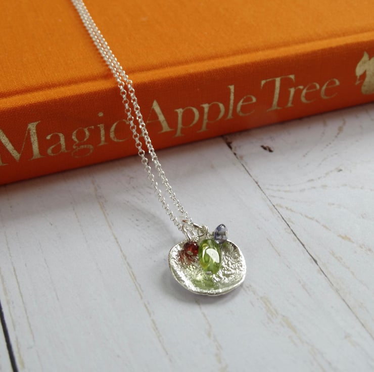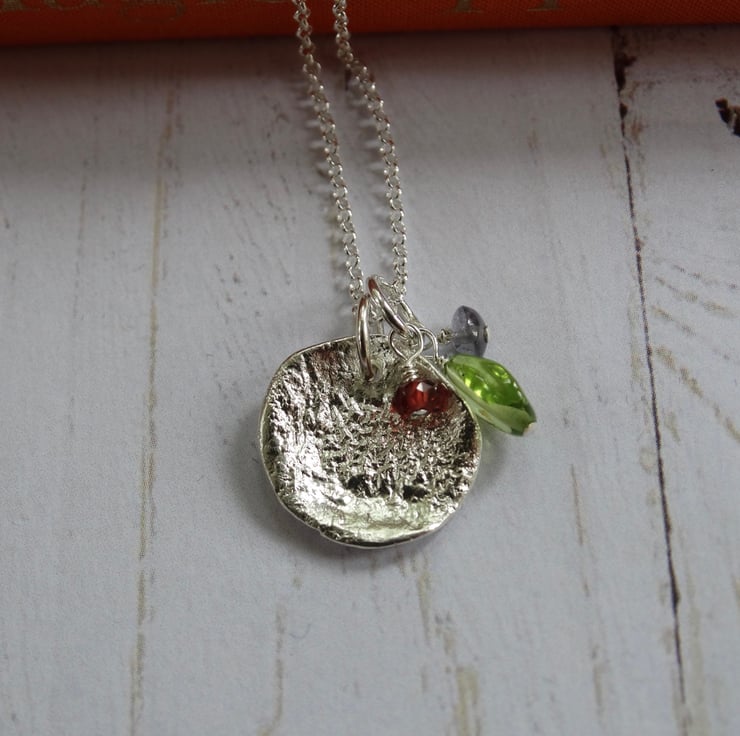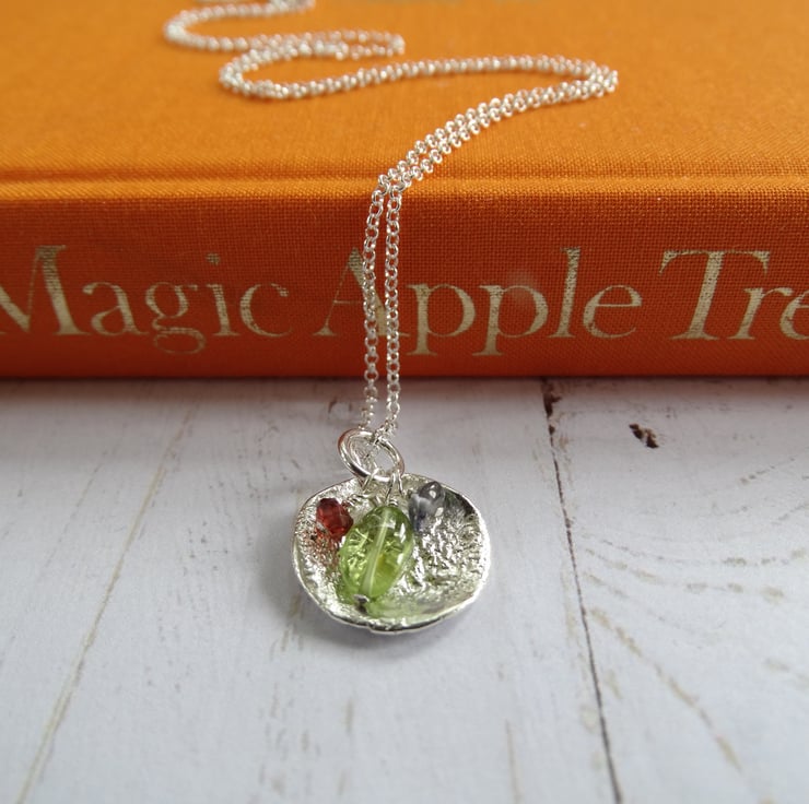 This disc has been sawn by hand from recycled sterling silver sheet then heated to give it a wonderful molten and dimpled texture. I've made up a little cluster of gemstone charms in peridot, iolite and garnet to hang with it. Each gemstone hangs on a sterling silver wire suspended from a sterling silver ring. The silver has been polished by hand to give it a lovely soft glow rather than a high shine.