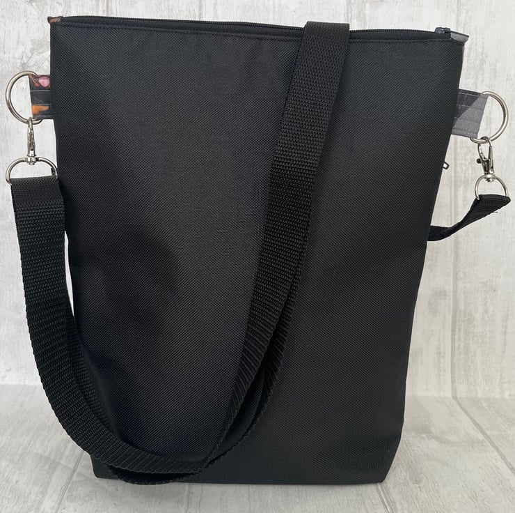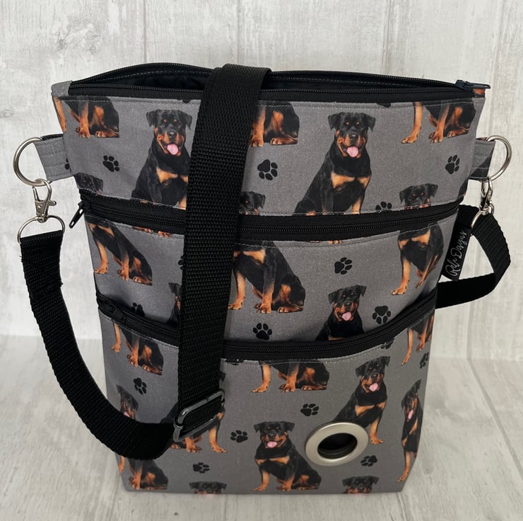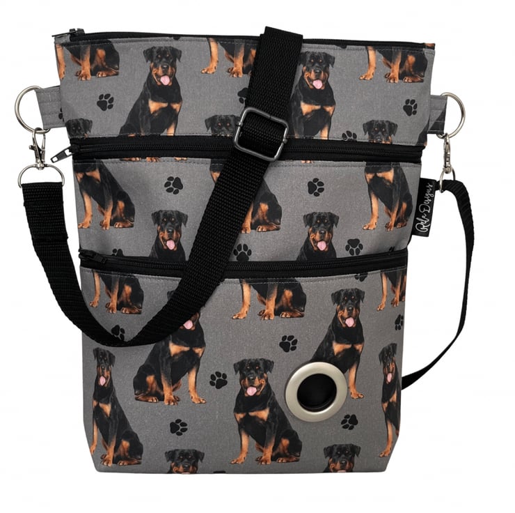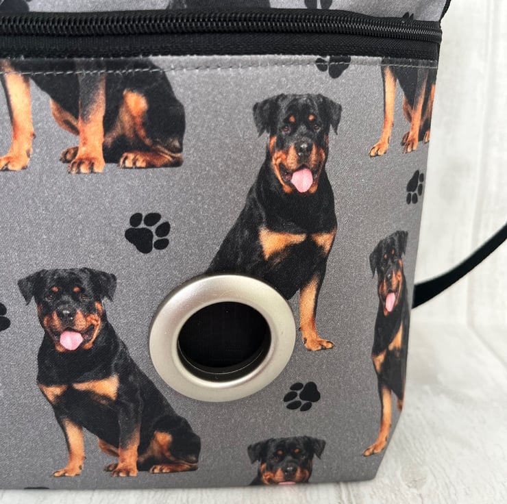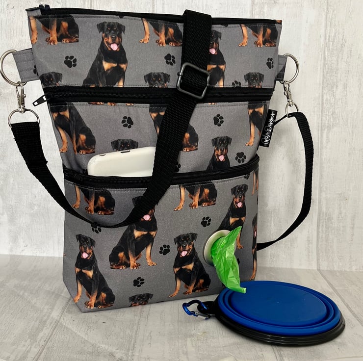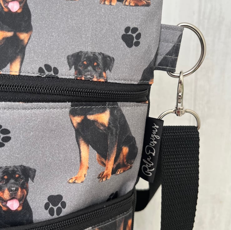 This Rottweiler cotton print cross body dog walking bag has a plain black waterproof nylon canvas back and is lined with a black waterproof nylon lining. This handy bag will hold all your essentials for walking your dog.