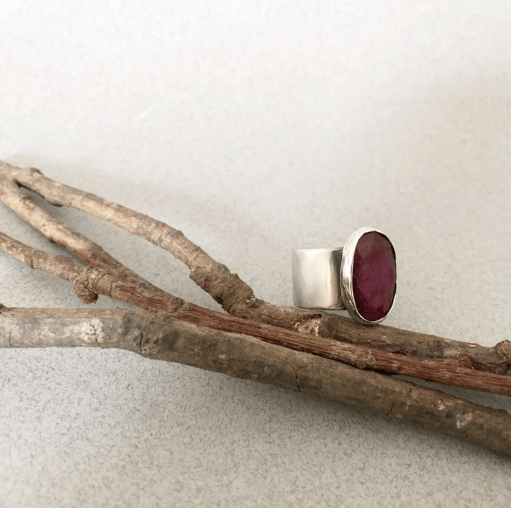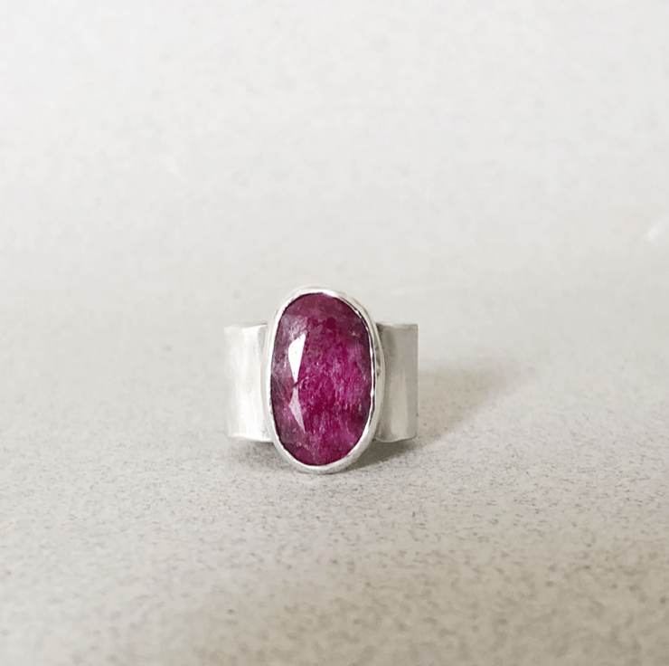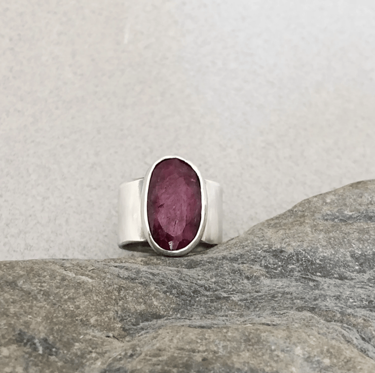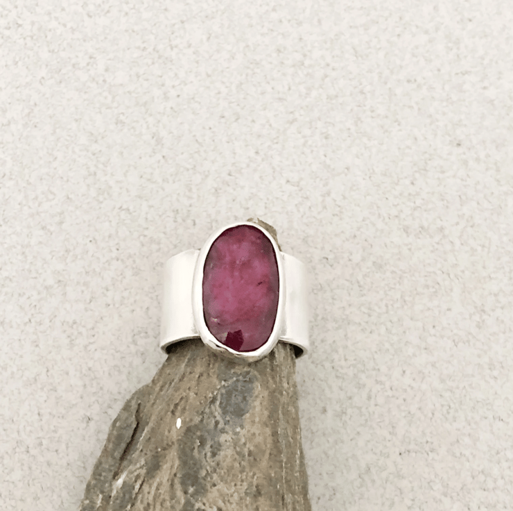 This ring is entirely handmade and is one of a kind. The silver band measures 12mm wide and the ruby gemstone is roughly 18x12mm. It's a simple setting but makes lovely statement ring because the red ruby stone is large but not overpowering. It's a very wearable piece of silver jewellery and will go with anything.