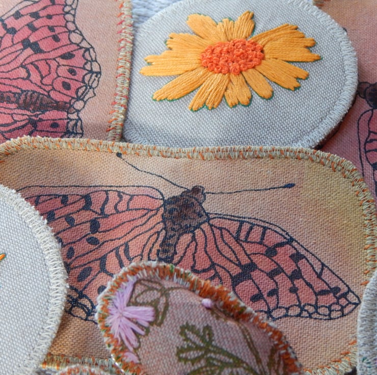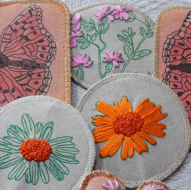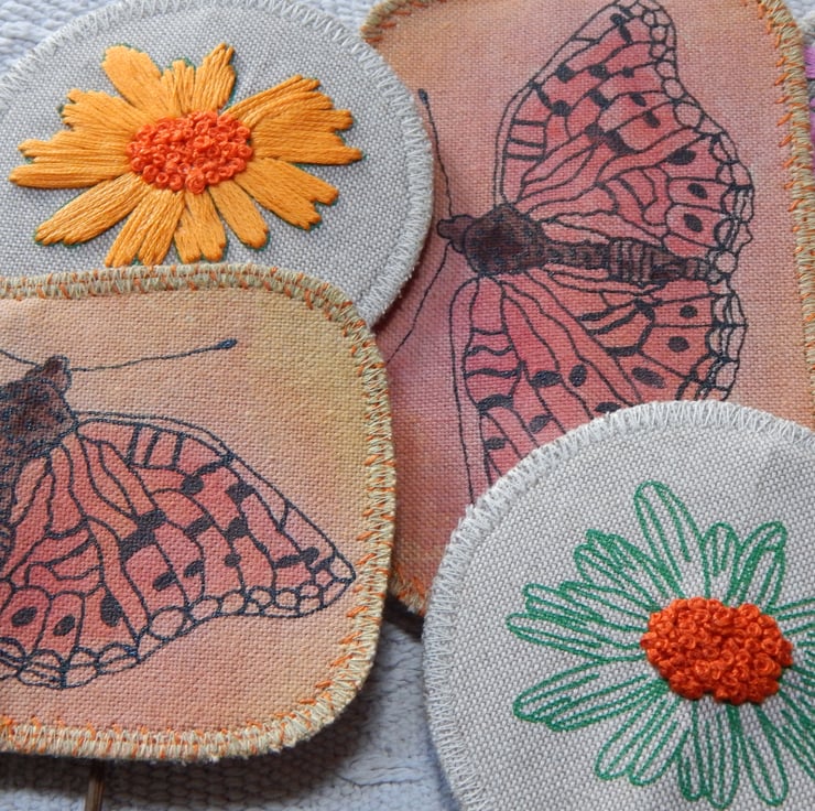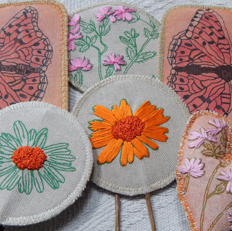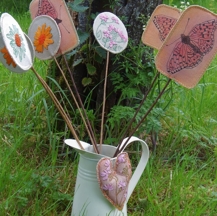 There are 3 daisies that have been screen printed, 2 have been hand embroidered with the centres and petals in shades of orange, 1 daisy has a central french knot embroidered centre. There is 1 screen printed and hand embroidered red campion. There is a small stuffed heart to match which has a wired top so it can either hang or be twisted over to hang it from the side of the vase.