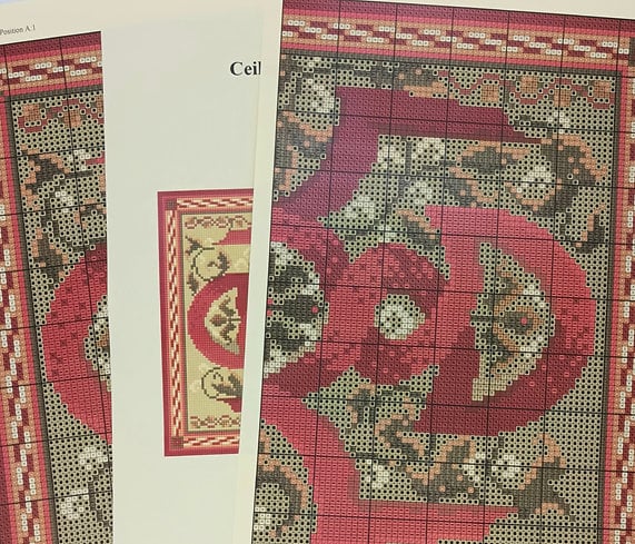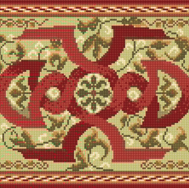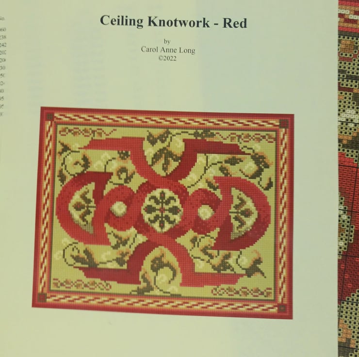 The Ceiling Knotwork (Red) Tapestry Kit design was inspired by the ceiling mural depicting a Fertility goddess at Traquair House. There is a panel between the beams which show this intriguing design. This design is one of a pair, the other being the Ceiling Knotwork (Blue) design.