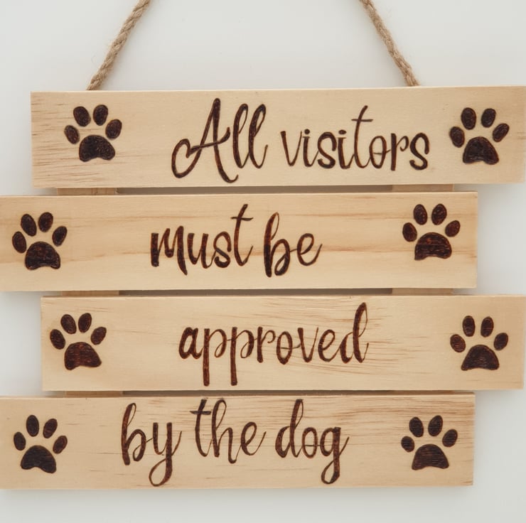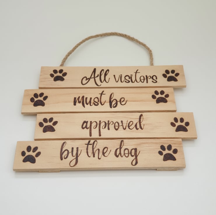 This funny wooden sign would make a great gift for a dog lover. The sign has been lovingly handburnt using the art of pyrography with the words 'All visitors must be approved by the dog' and 8 handburnt paw prints. The wooden sign is ready to hang from the attached twine and would look great displayed on a wall or hung from a handle. The wood has been finished with several coats of interior satin varnish for protection.
