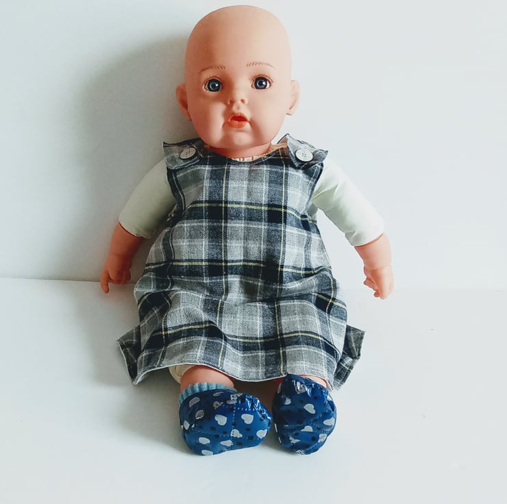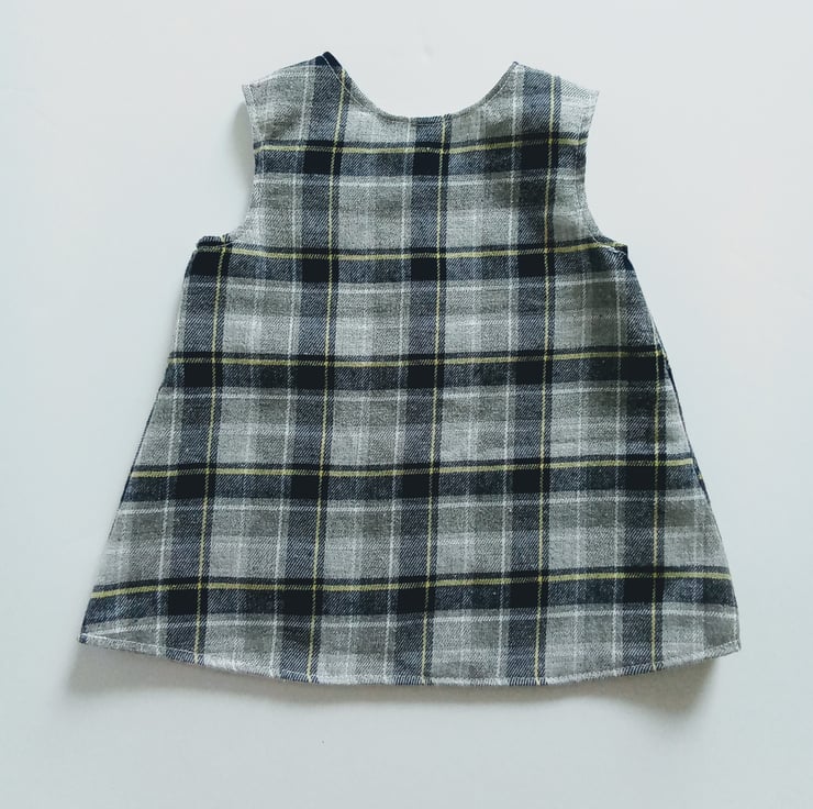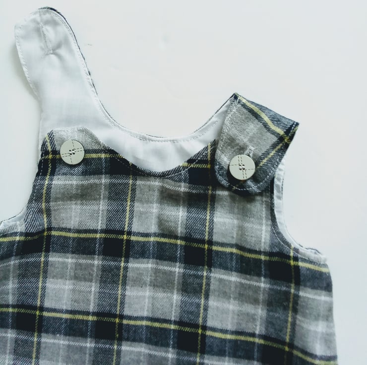 A line style dress/pinafore in a grey Tartan design brushed cotton. Fully lined in white polycotton with button fastenings.