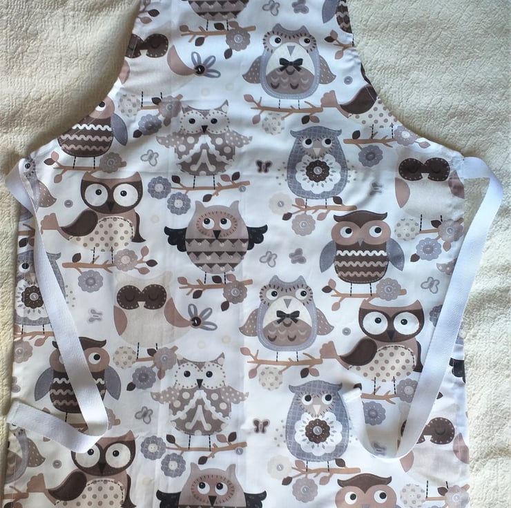 I couldn't resist this beautiful cotton fabric, which I have made into aprons with acrylic webbing straps. It is off-white with stylised owls printed on it in various toning shades of brown. Each owl stands on a branch of its own. The owls may not appear in the same position as the ones in the photo. The apron measures 28" (71 cm.) from neck to hem, and 21" (53 cm.) at the widest point, and has straps sufficiently long to fit most adults. It is machine washable.