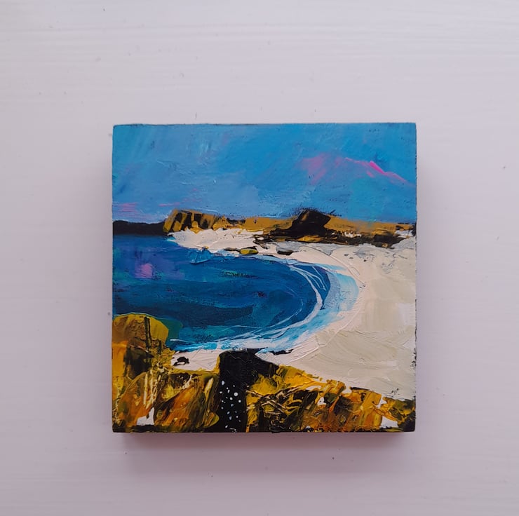 This 10 x 10 cm painting (1st image) is varnished signed on the back and has a hook ready to hang. Great to brighten up a small corner or to give as a gift.