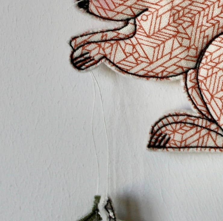 A delightful hanging decoration which is created using cotton cloth, 100% wool felt, metallic thread and free hand machine embroidery; multiple layers of cloth are sewn together and cut out by hand using very sharp scissors. With a linen thread to hang.