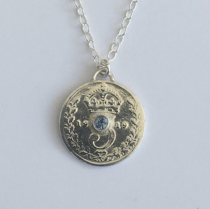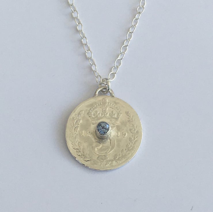 This pretty pendant is set with a beautiful Sapphire. There is a small amount of wear to the coin but the details are still very visible .