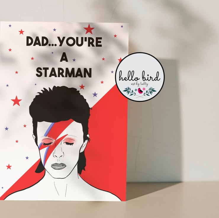 Original design greeting card featuring my own illustration of the legend that is David Bowie. Illustration features Bowie's classic lightning bolt make up across the face. Message on the card reads 'Dad...You're a Starman.' If you would like the name changed, please do just drop me a message. Perfect card for so many occasions - father's day / anniversary / birthday or just to tell someone special you think they're ace! Ideal gift for any David Bowie fans.