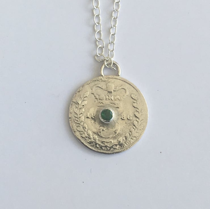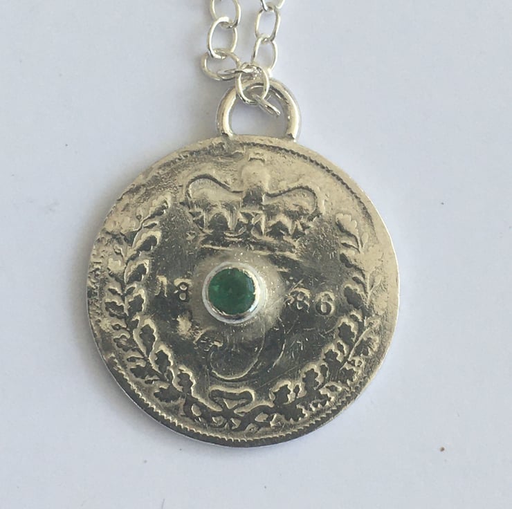 This pretty pendant has been hand set with a deep green Emerald .