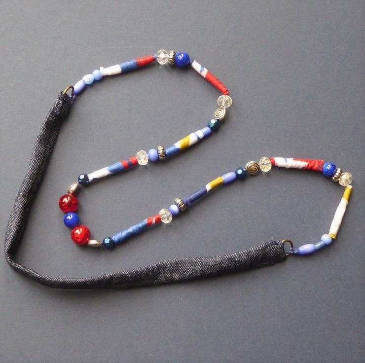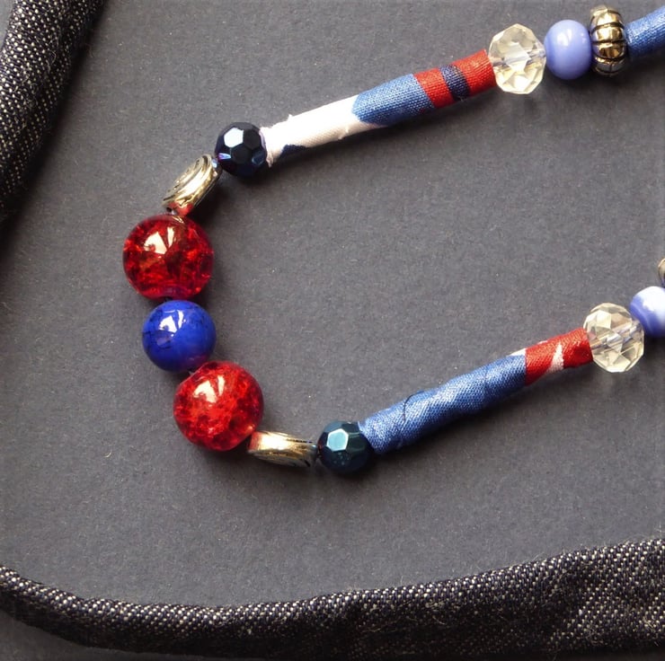 Hand made textile beads are mixed with a generous arrangement of glass/metal and acrylic beads to add just a little sparkle. This light to wear necklace is so comfortable with a soft denim fabric neckband eliminating tricky fastenings. Colours of red white blue and gold make this suitable for regal or even seaside occasions.