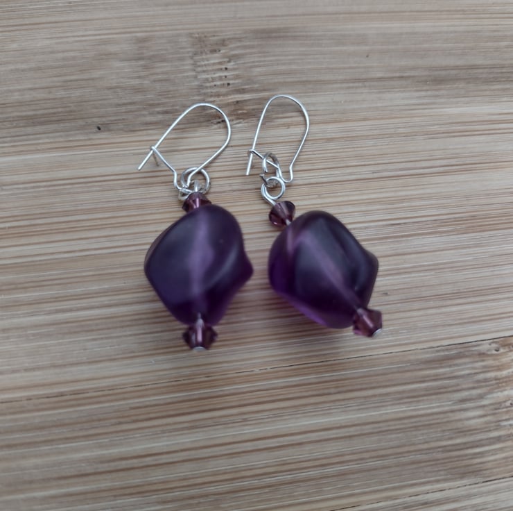 A purple acrylic bead together with purple bicone crystals. The earwire is silver plated and the earring drop is 1 inch. These earrings will come to you in an organza gift bag.