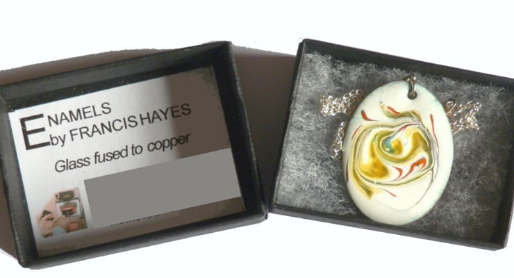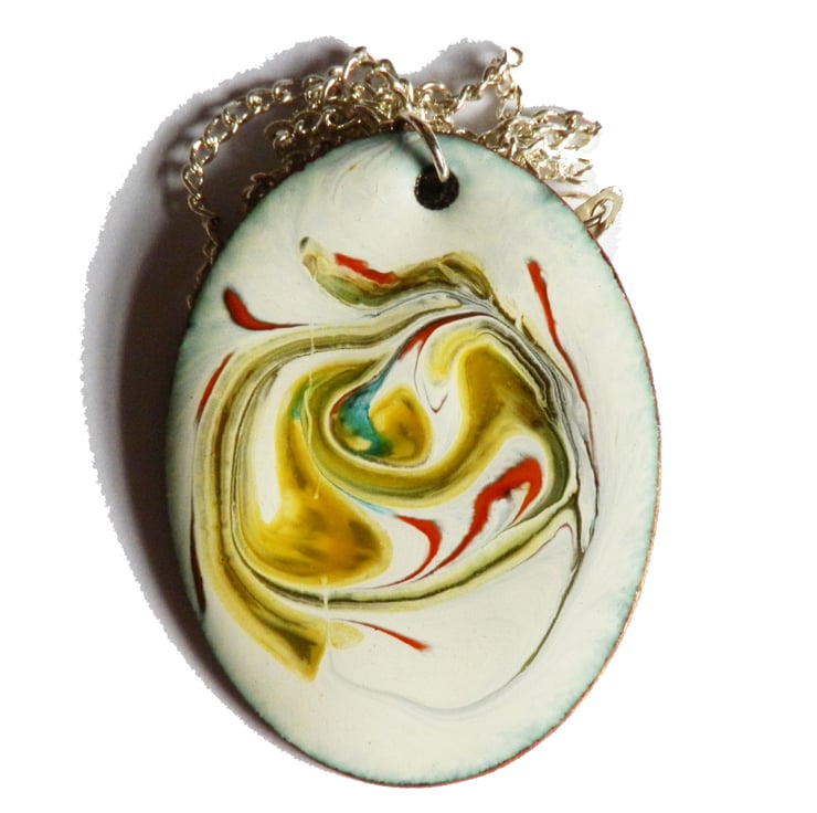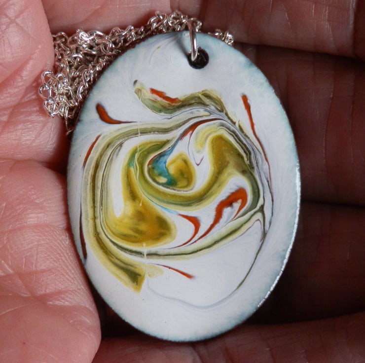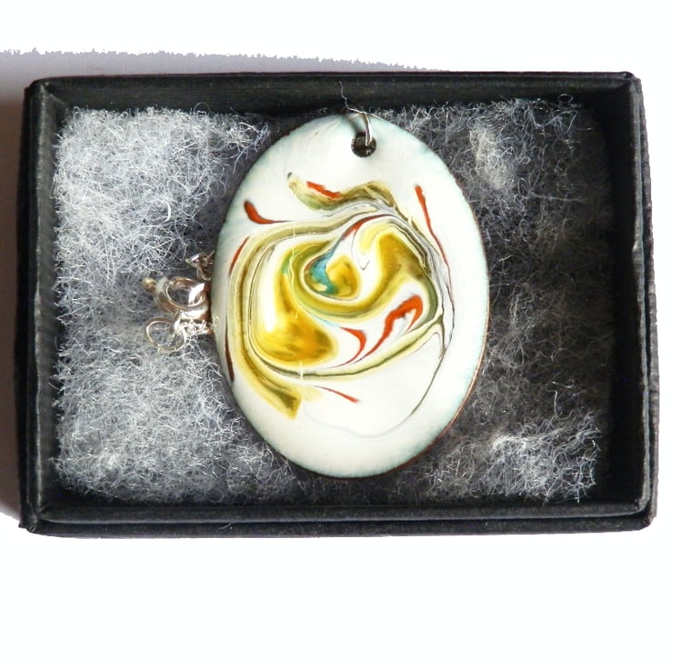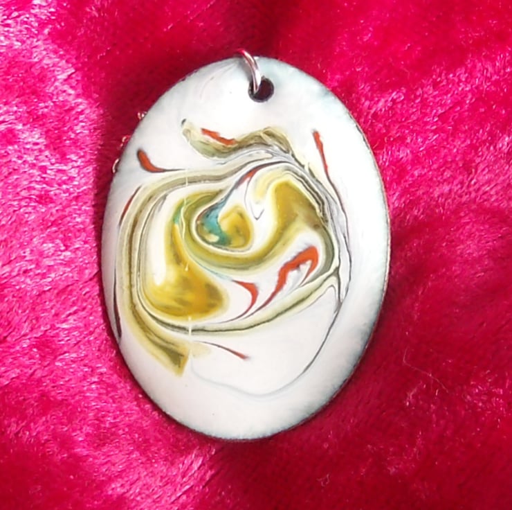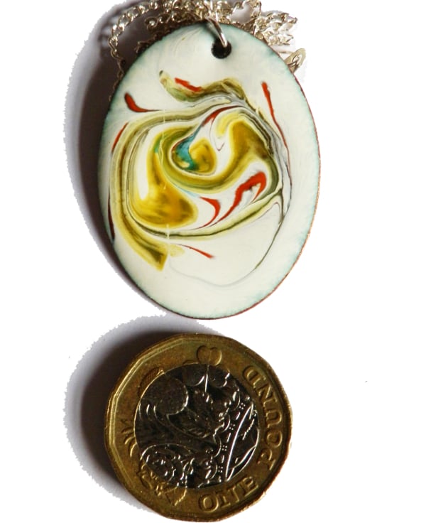 After building a white background of several layers of enamel on the oval copper blank, I have added rods of red, green and gold enamel and drawn through these while they were at red hot in the kiln, generating the random pattern you see.