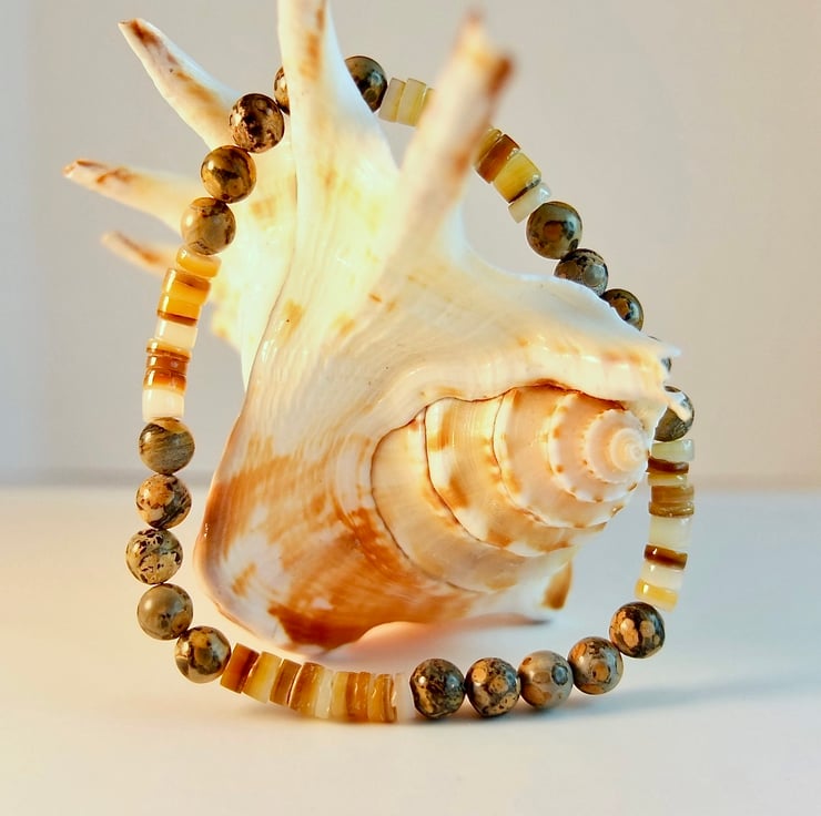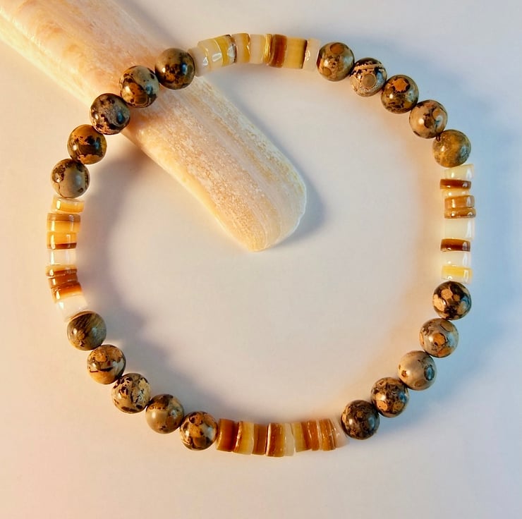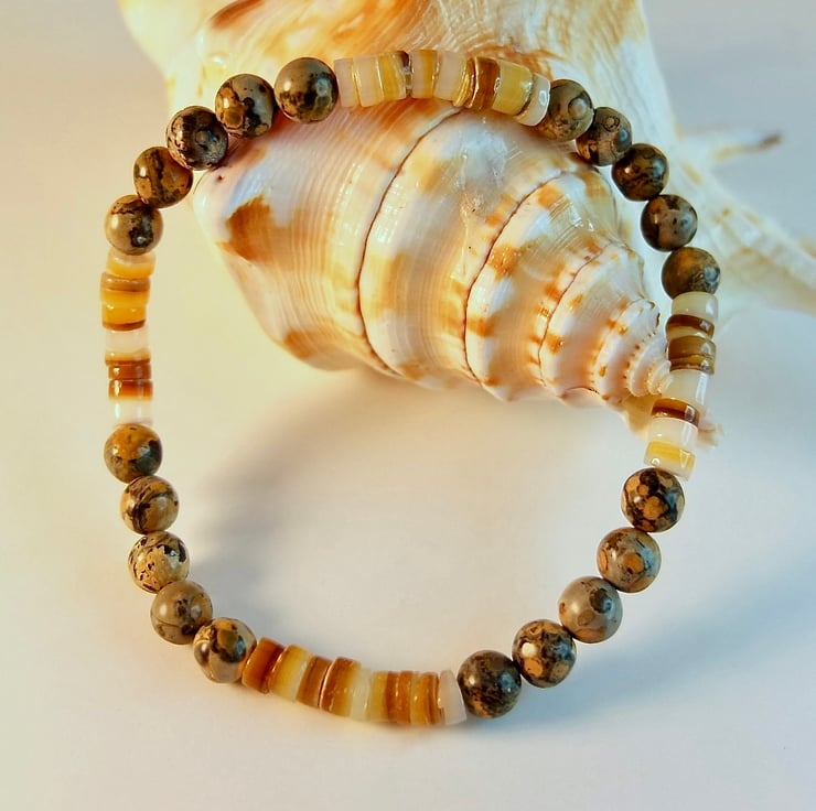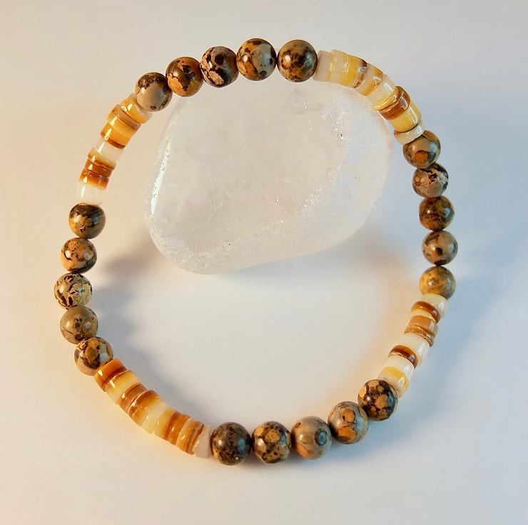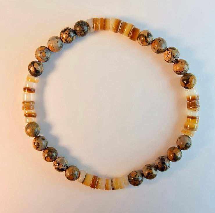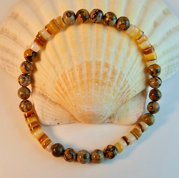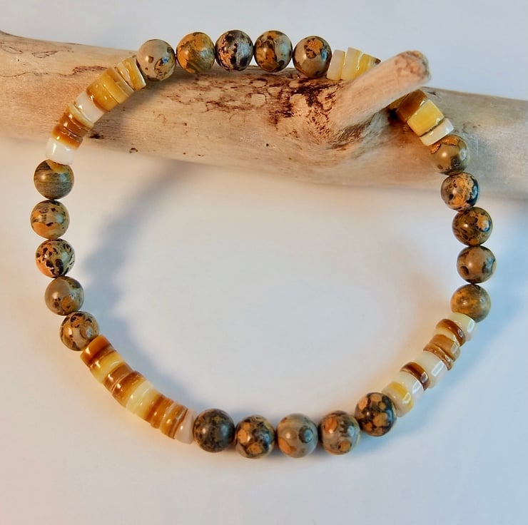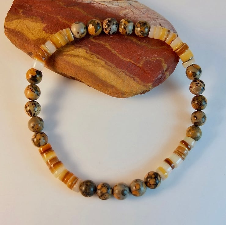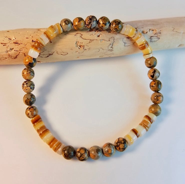 Attractive, rugged stretch bracelet made up of 6mm Leopardskin Jasper and Gold Lip Shell heishi beads.