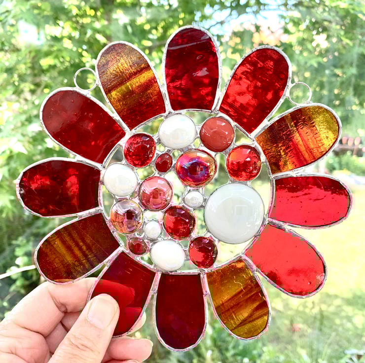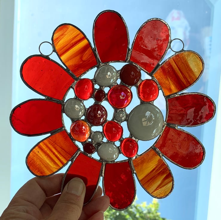 Each of the 12 daisy petals measure 3 cms by 4 cms and has been made from 12 different types of glass, there are also 16 globs in the centre. The overall size of the suncatcher is 17.5 cms in diameter.