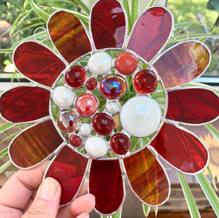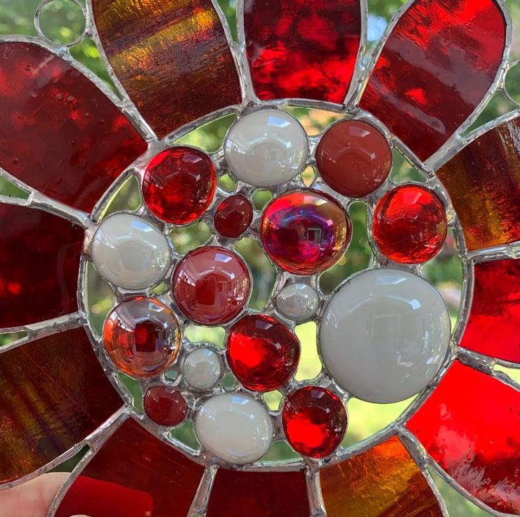 This one has been made using 3 different types of red glass with a selection of red and white glass globs in the middle.