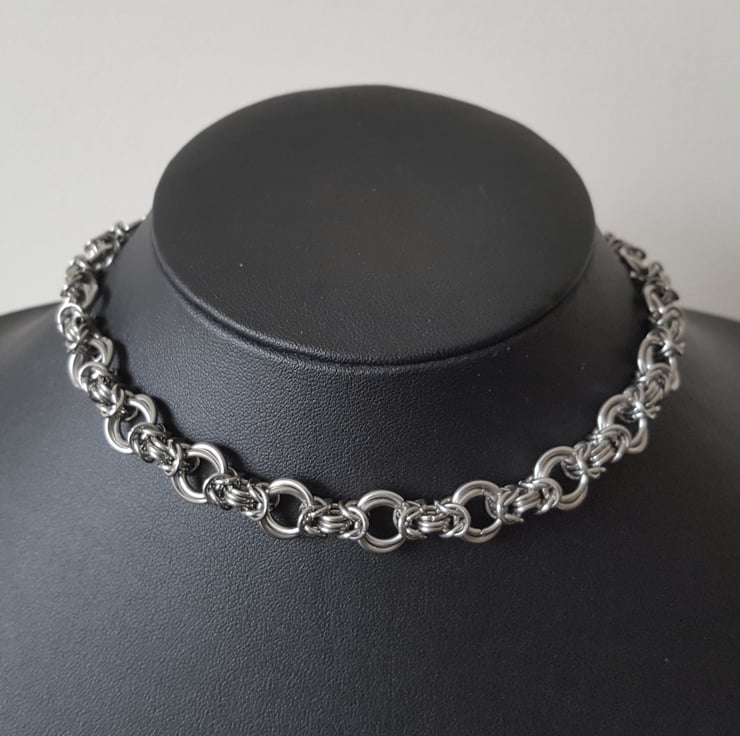Handcrafted using premium quality stainless steel chainmail rings expertly weaved using a Mobius-Byzantine combination linkage. The design features a beautiful byzantine chain with contrasting mobius flower sections giving this necklace an elegant and feminine aesthetic and unique style, the design is completed with a secure 316 stainless steel spring clasp and 2" adjustable extension chain to the back.