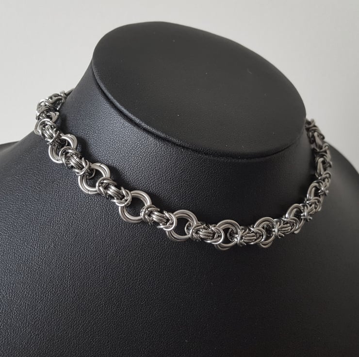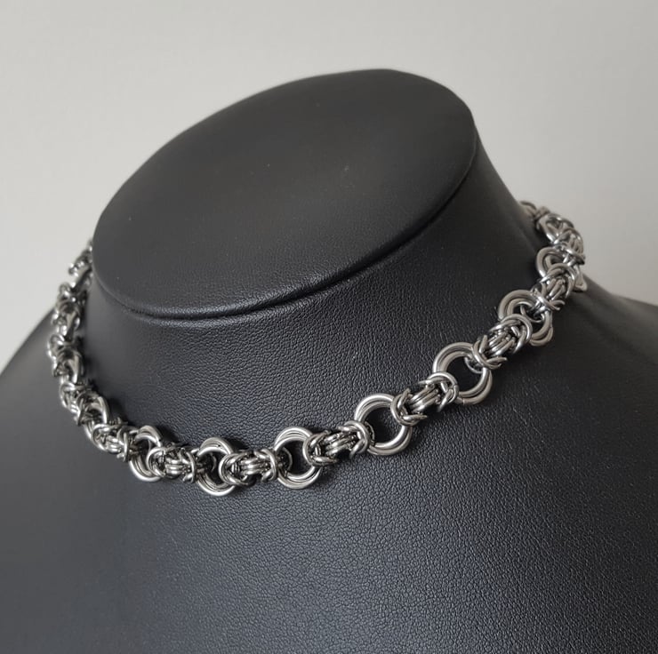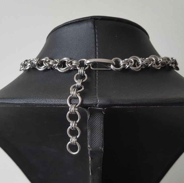Handcrafted using premium quality stainless steel chainmail rings expertly weaved using a Mobius-Byzantine combination linkage. The design features a beautiful byzantine chain with contrasting mobius flower sections giving this necklace an elegant and feminine aesthetic and unique style, the design is completed with a secure 316 stainless steel spring clasp and 2" adjustable extension chain to the back.
