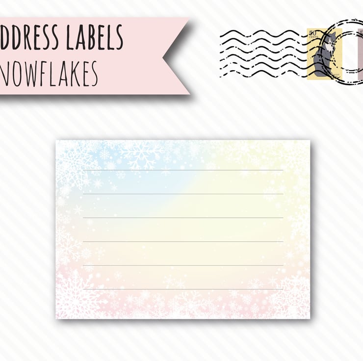 A pack of 10 x self-adhesive address labels with a pretty snowflake themed border over a pastel background. Handmade by me on a digital printing press.