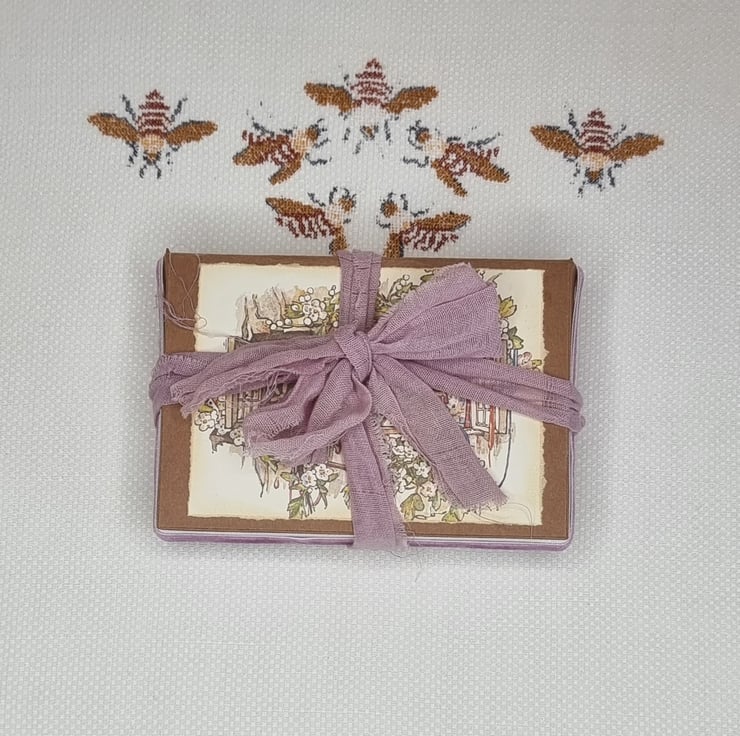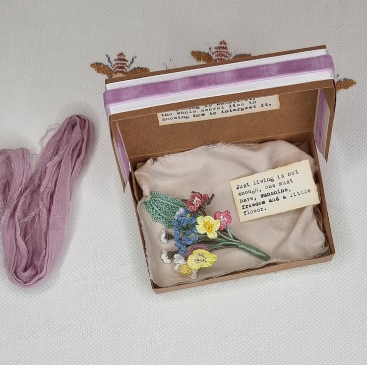 Lots of crocheted little wild flowers made ino a brooch , primrose, viola, forget-menots-, corncockle and just a little pink flower . all packaged in a one off hand made little box by me.
