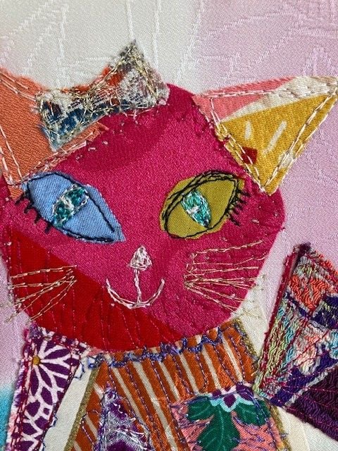 My collection of Japanese vintage kimonos and remnants provide endless inspiration for my work. I have visited Japan several times and know that cats are regarded as lucky.
