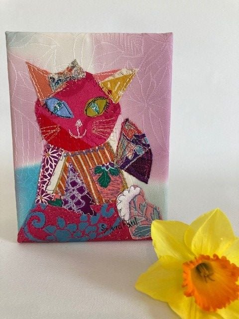 Cute Kimono Cat is made using Japanese vintage kimono silk remnants. Its a unique design and created using free motion machine embroidery. It measures 12 x 16 cm and is stretched over a wooden frame like a canvas. The back is lined and there is a hanging loop.