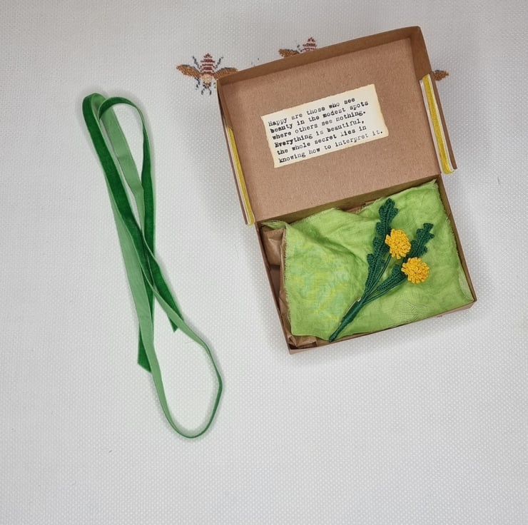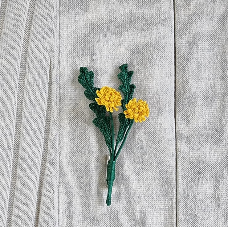 a little crocheted dandilion brooch, 4inch long. made using a 0.5mm hook and cotton thread.