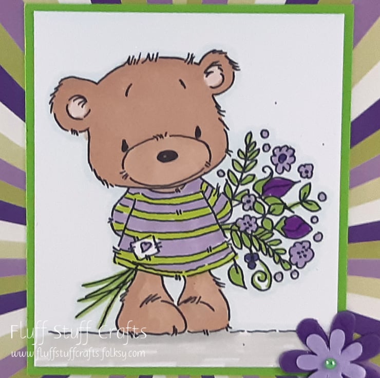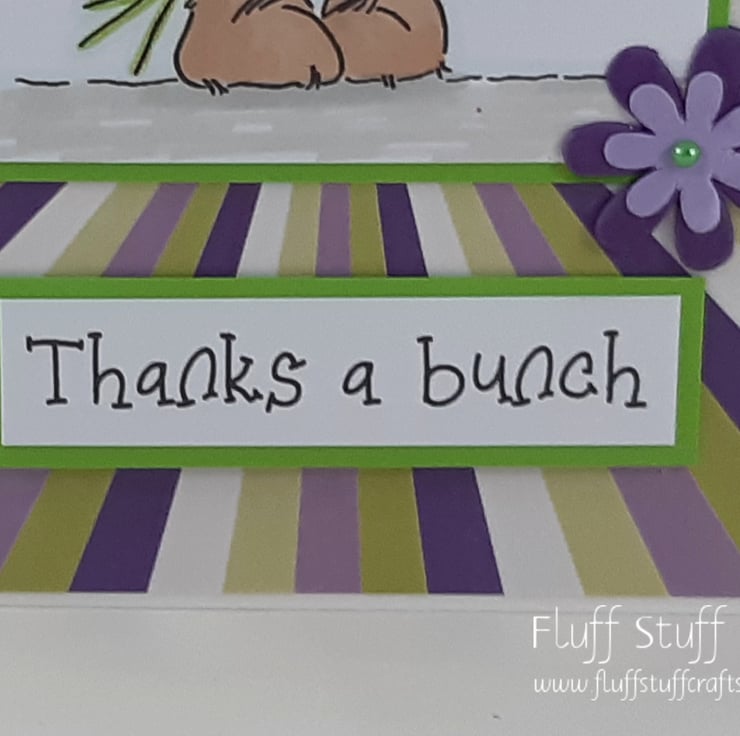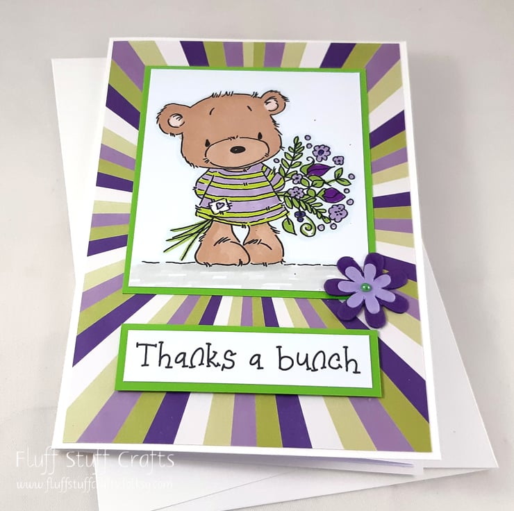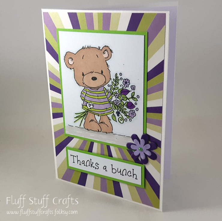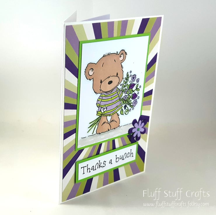 A6 thank you card featuring an image of a bear with a bouquet of flowers which has been coloured by hand. The image and sentiment 'Thanks a bunch' have been mounted onto lime green card and overlaid onto a purple and green background. The card has been embellished with purple paper flowers with a green pearl gem centre. The insert has been left blank for your own message.