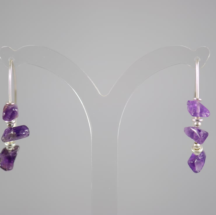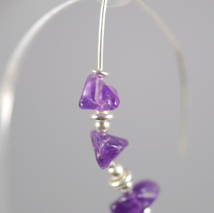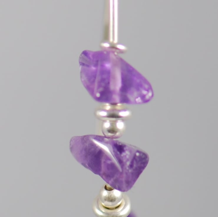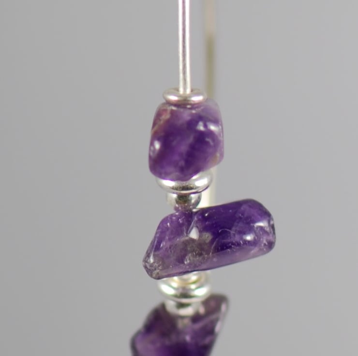 A pair of handmade earrings, using amethyst crystal chips, with sterling silver beads, and sterling silver wire, where the amethyst and silver beads are threaded onto the wire that then goes directly through the ear, and down at the back.