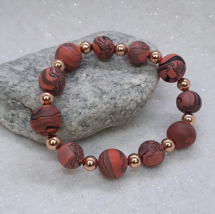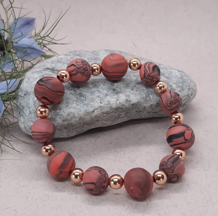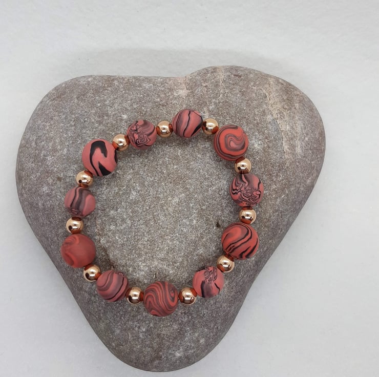 A pretty bracelet featuring a mixture of deep coral and black polymer clay in a unique swirl design. The handmade beads measure approx. 12mm with 6mm rose gold plated rounds in between.