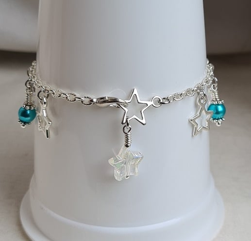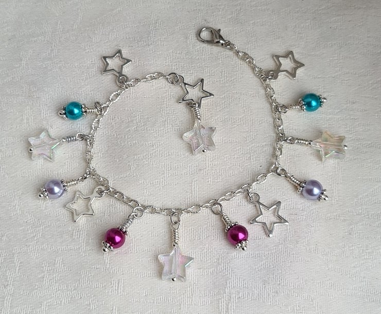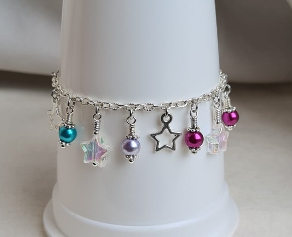 Bracelet size is approx 7.1/2 inches. Would fit a wrist size of approx 6.1/4 inches (looser fit) to approx 6.3/4 inches (maybe 7 inches) for a tighter fit. Chain and hollow stars are silver plated, solid stars are AB acrylic, beads are beautifully colourful glass pearls. Fastens with a trigger clasp.