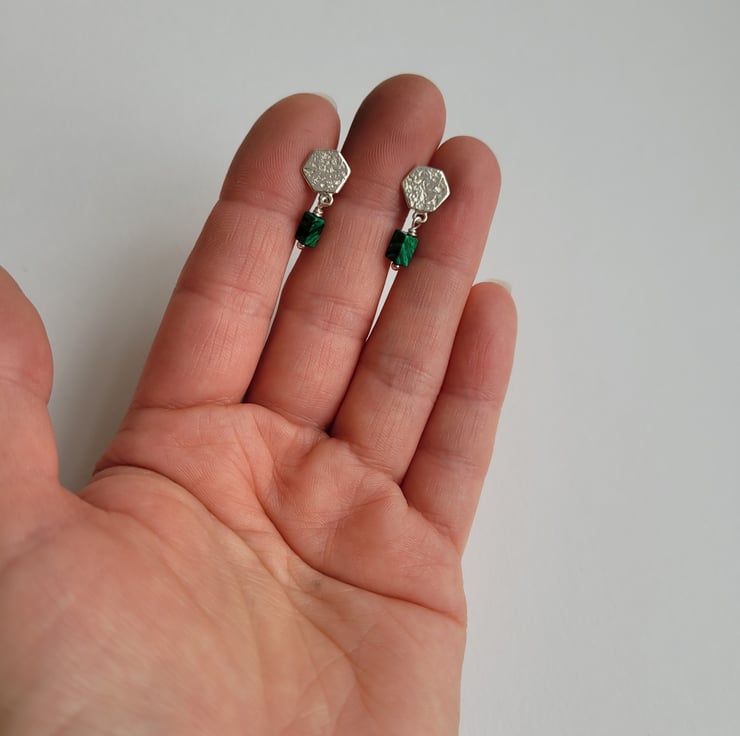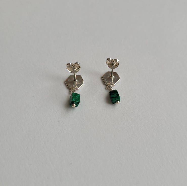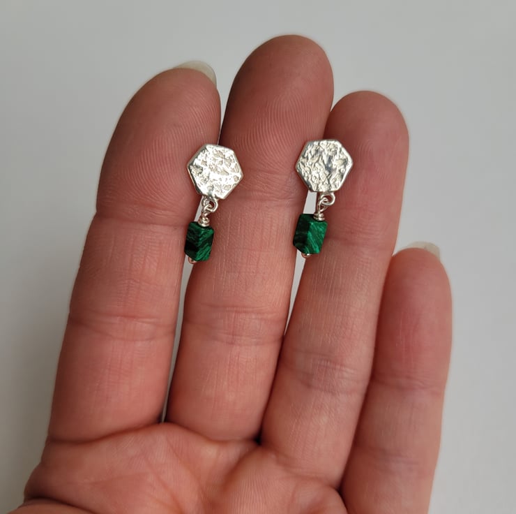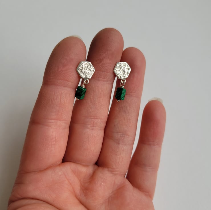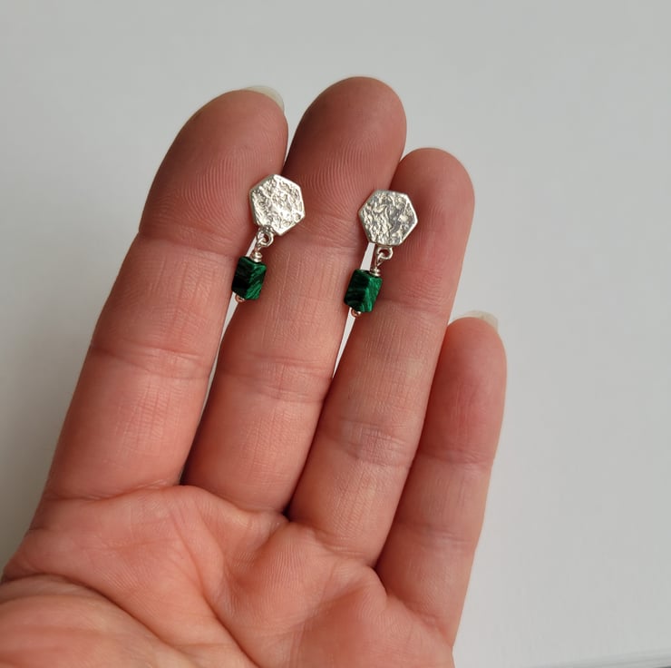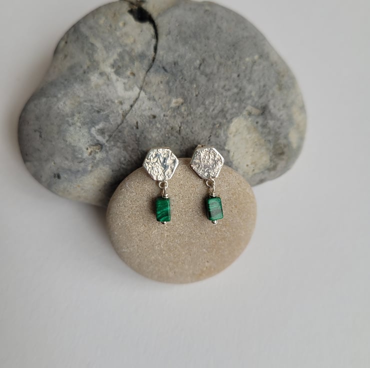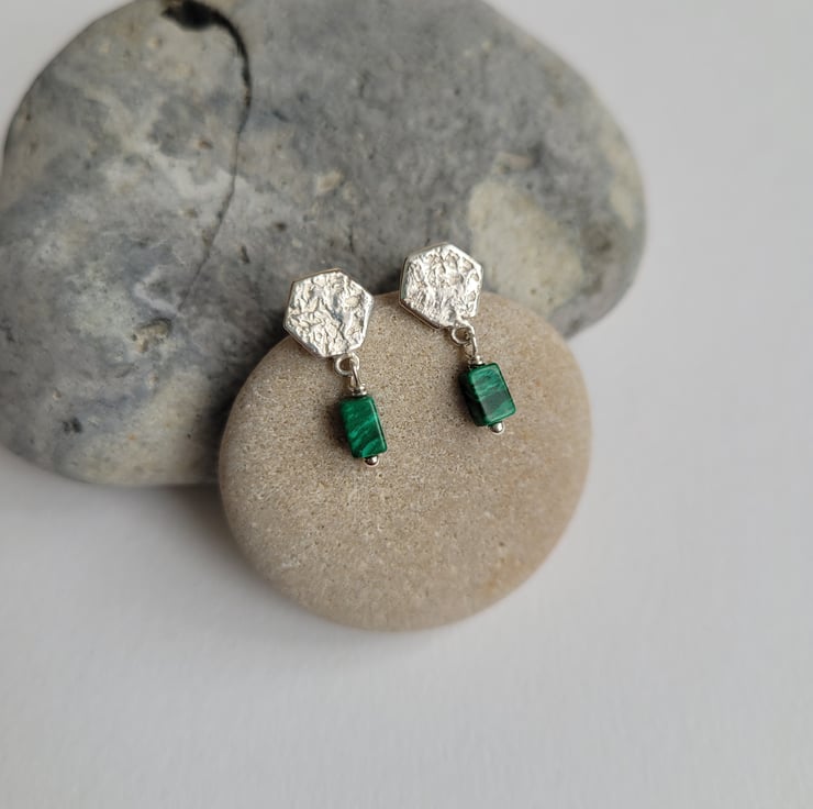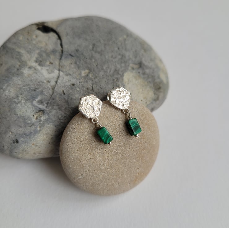 The small hexagons have been cut from recycled sterling silver sheet and hammered against concrete to form a rock, stone or pebble texture to contrast with the small rectangular malachite beads. The hexagons have stud posts and tiny oval links soldered onto them. The malachite beads are attached to the links with sterling silver wire pins with small silver bead to keep the malachite secure. The earrings are finished with sterling silver butterfly backs.