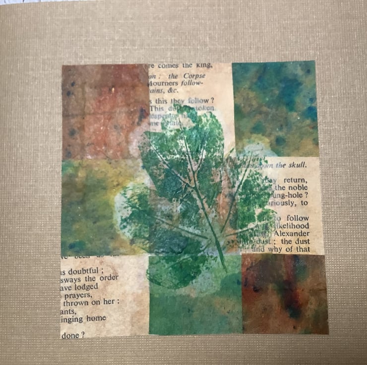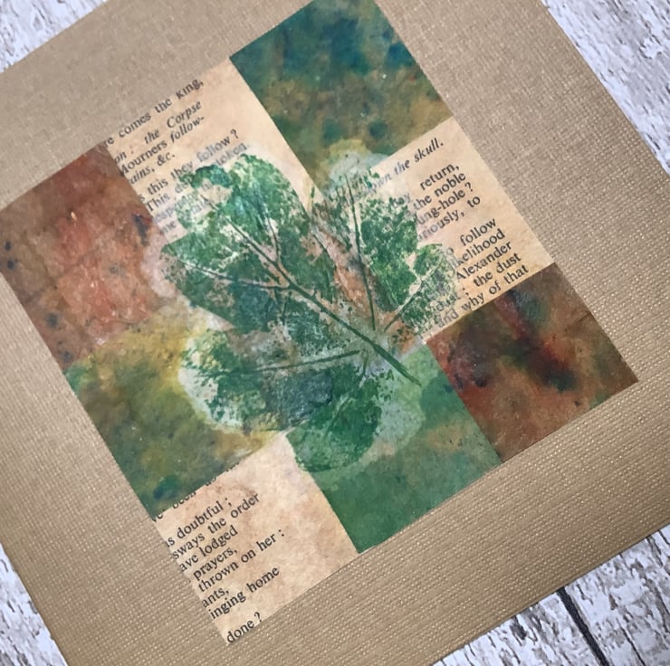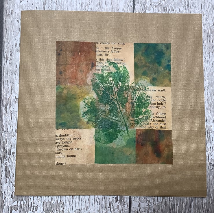 Beautiful handcrafted card made from hand painted papers collaged to form a background for the hand printed leaf print.