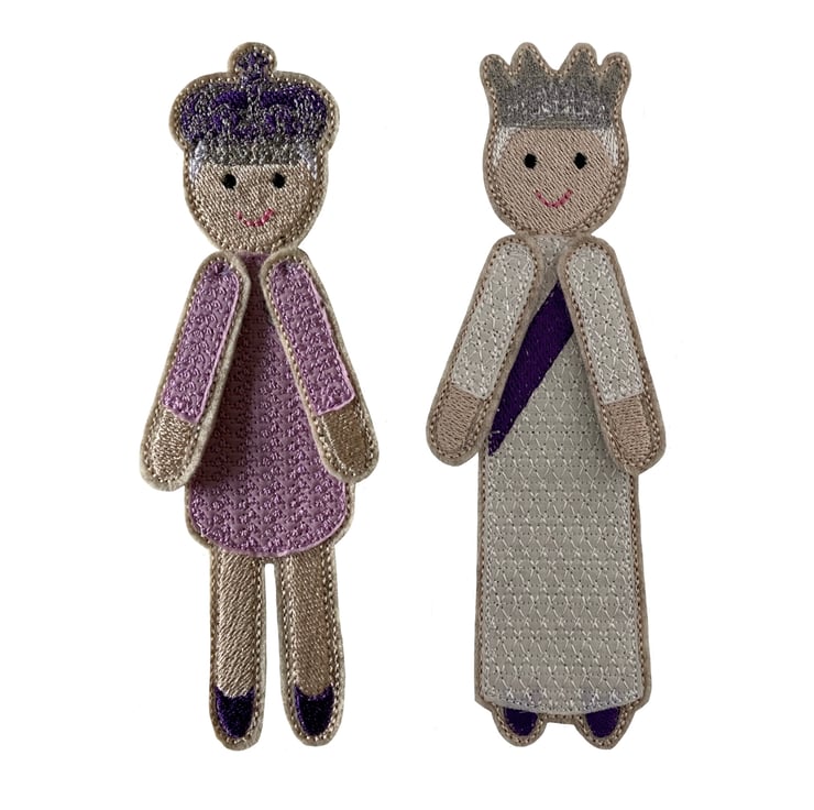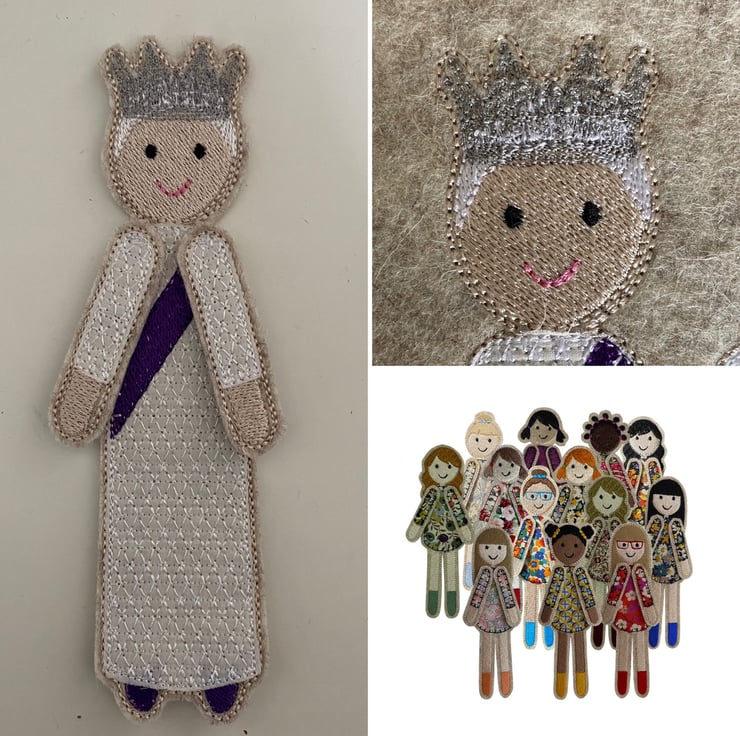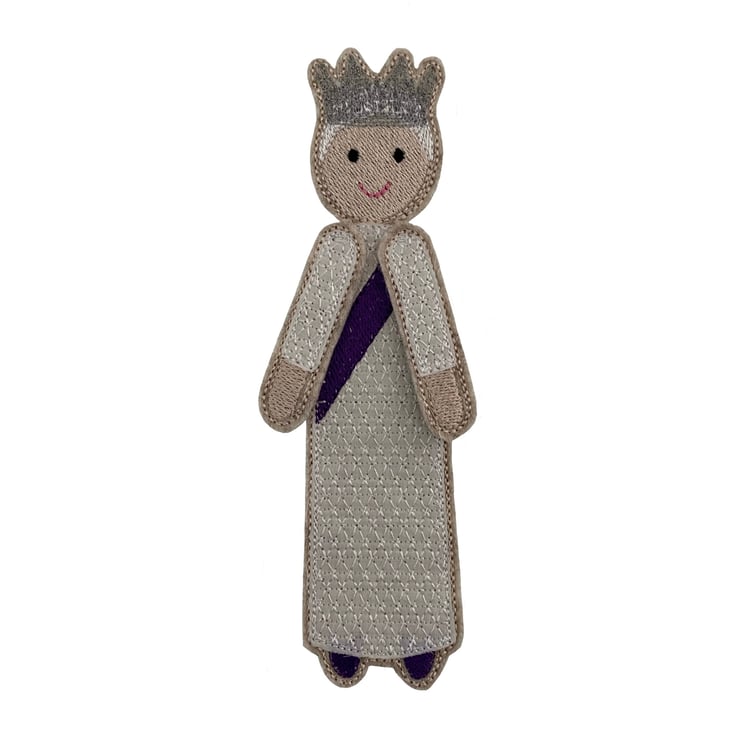 Jubilee Dolly is a regal bookmark which peeks over the page in her delicately embroidered gown and Silver crown. Dolly has a main body which sits behind the page with her arms and head peeking over the top. She is stitched using embroidery thread and a woven Liberty Cotton dress on a base of Wool felt.